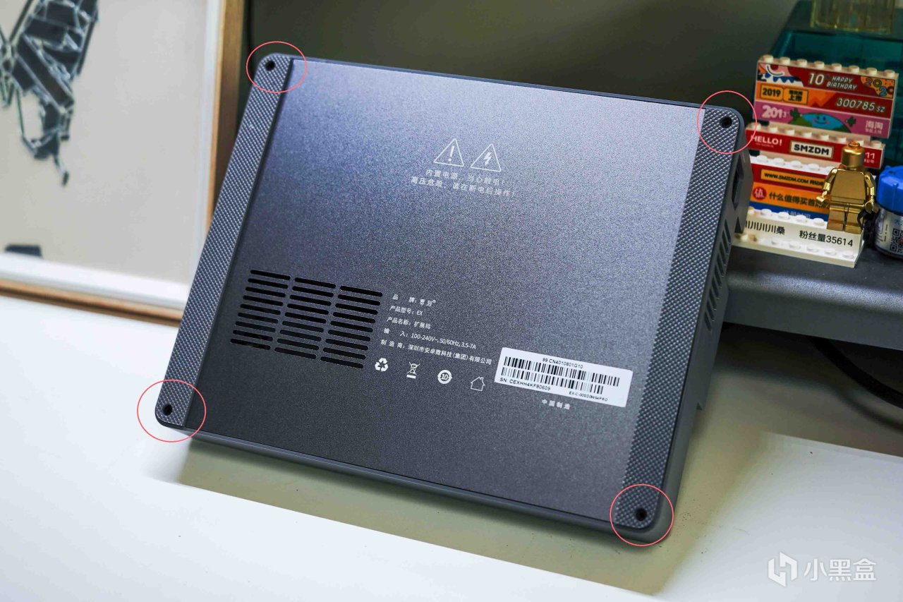 通过零刻EX拓展坞安装额外固态硬盘需要拆机,操作上没有任何难度,将设备反转,卸掉下图圈出来的四颗固定螺丝,之后就能取下底部挡板。