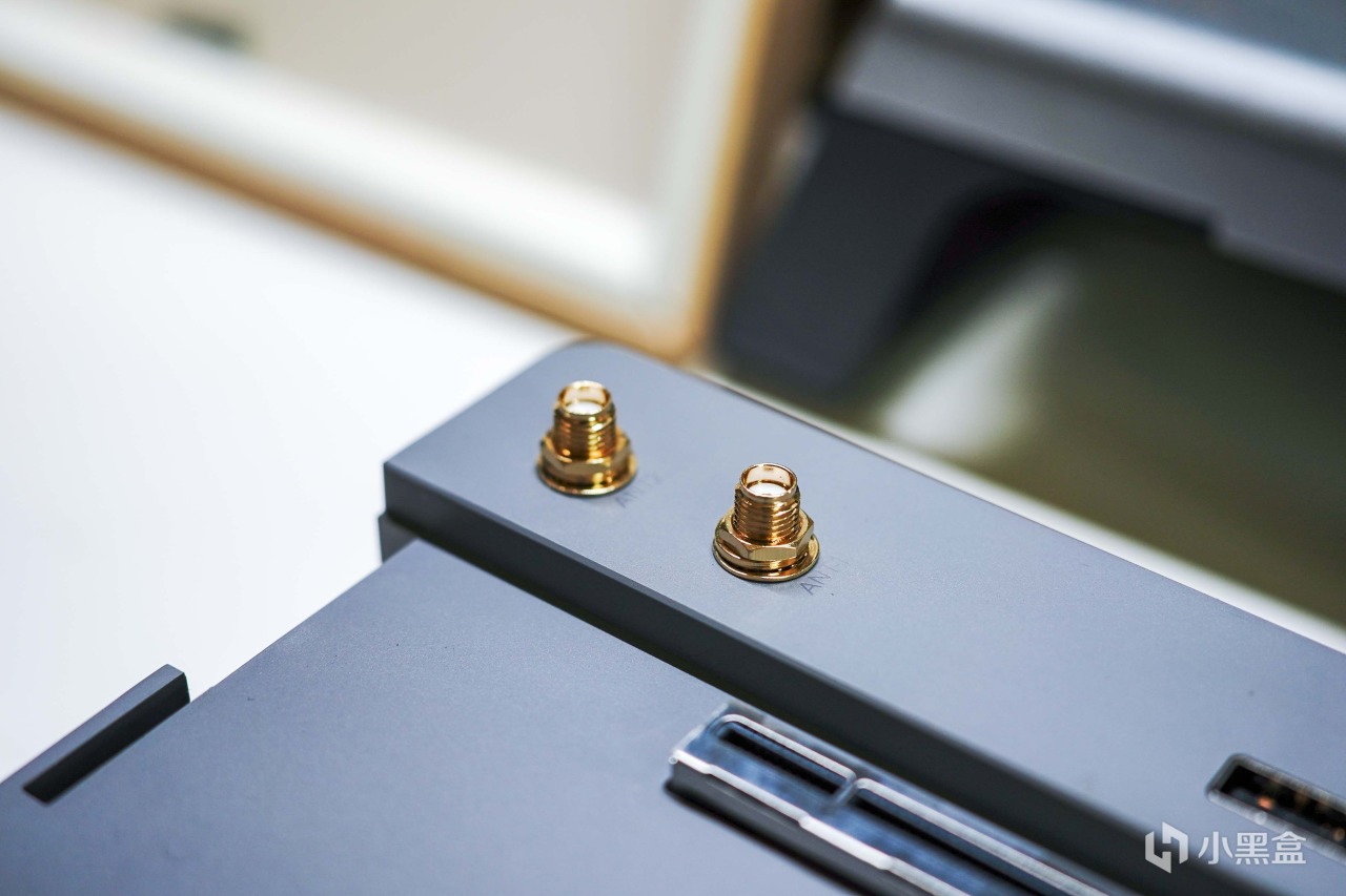 顶部左侧的两个接口用于外接无线网卡天线,采用了比较耐腐蚀的镀金工艺,不用的时候没必要单独保护。