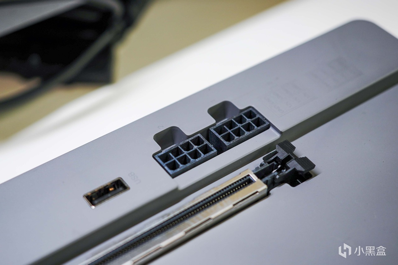 PCI接口上方的双8Pin为自带电源出来的显卡供电接口,如果觉得原装线材不够好看,可以使用标准线序的第三方线,边上的低速USB口不太建议用于传输数据。