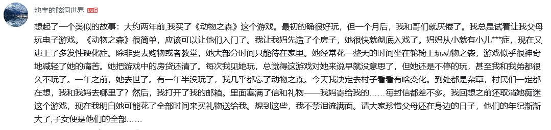 再然后又是两年,儿子突然想起了母亲曾经的热爱,于是登上了账号,回到了那个与母亲一起生活的小岛。