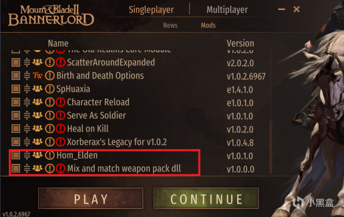 2、在启动器的Mods页面按照如下图所示勾选和排序“Hom_Elden和Mix and match weapon pack dll”页面后点击“PLAY”即可正常游戏。