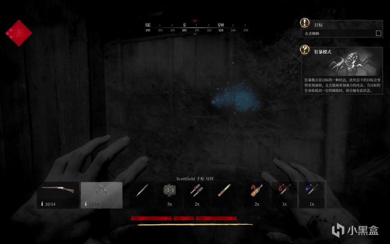 《猎杀:对决1896》与同类型的游戏之中不太一样,一局游戏人数上面最多只有12个人,但是千万不要觉得人数少了就掉以轻心,在游戏之中我们将会拥有一个十分强大的能力,那就是黑暗视野,这和我们游戏的目标一样,我们需要通过黑暗视野去探索任务线索,视野之中蓝色的光芒会指引我们前往目标点,然后收集线索狩猎BOSS们。