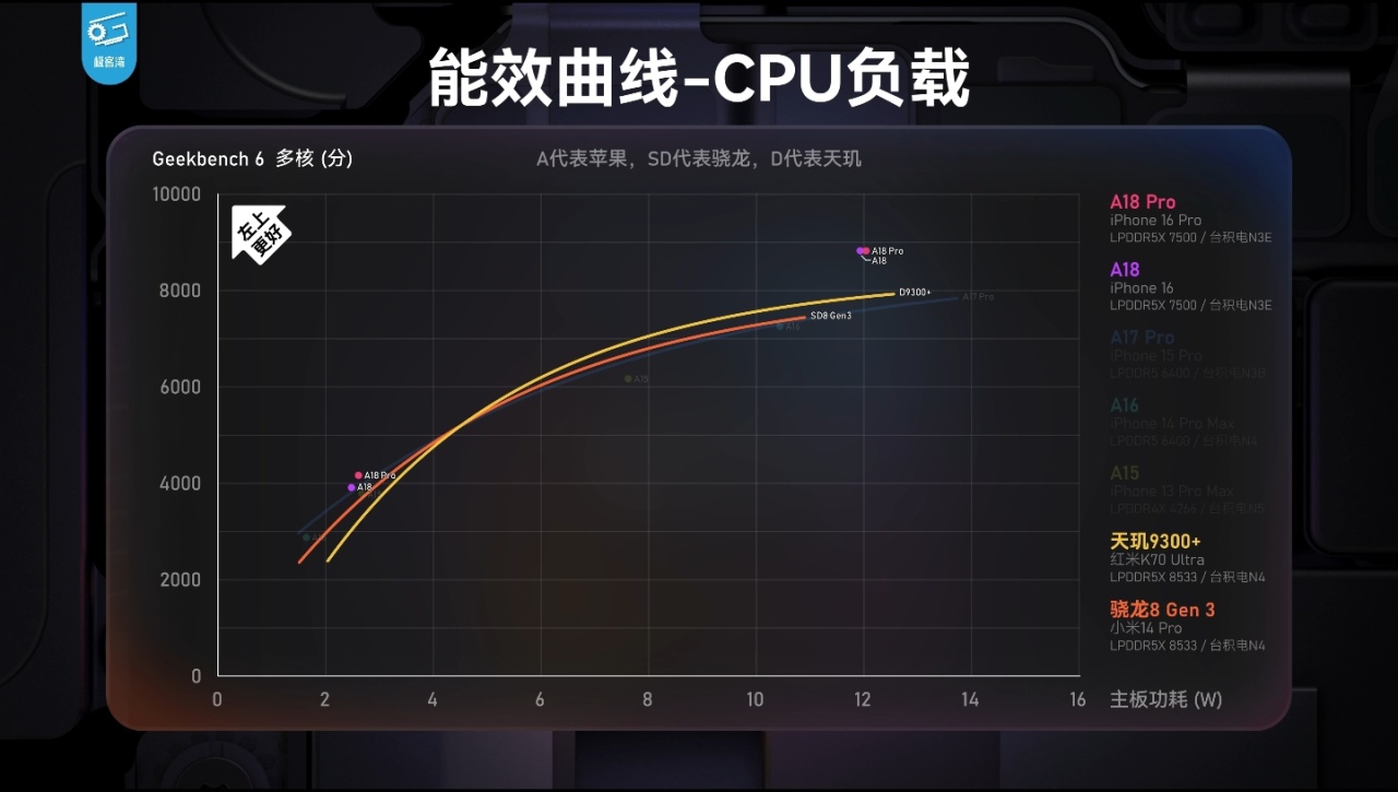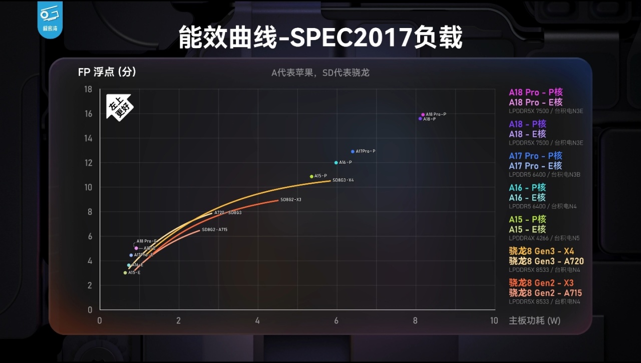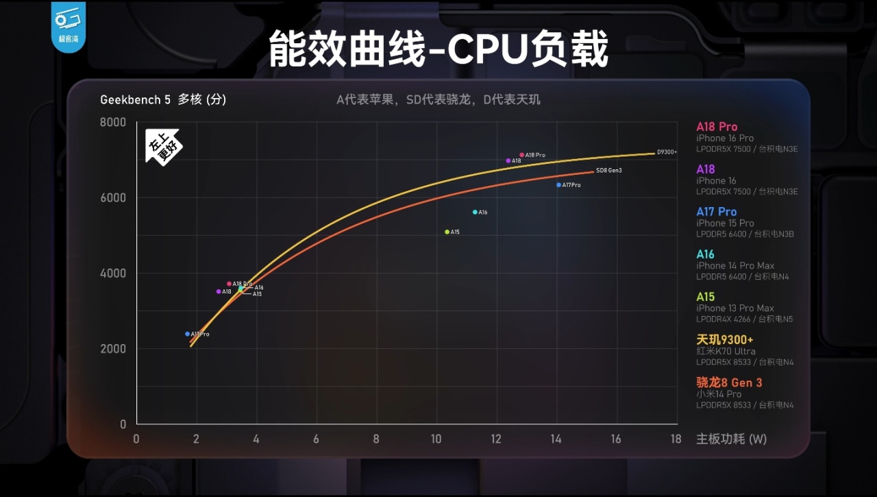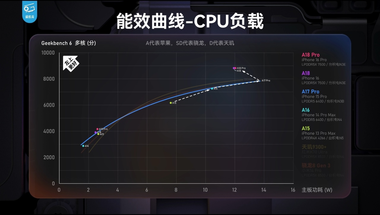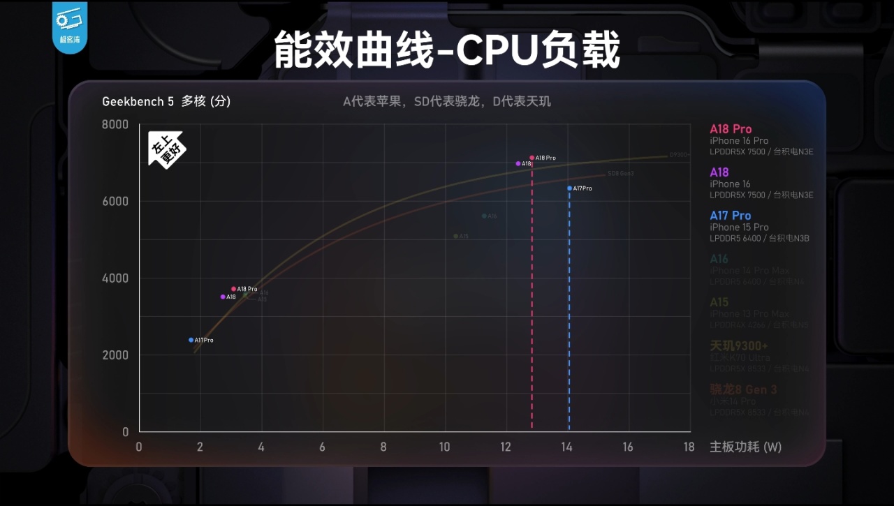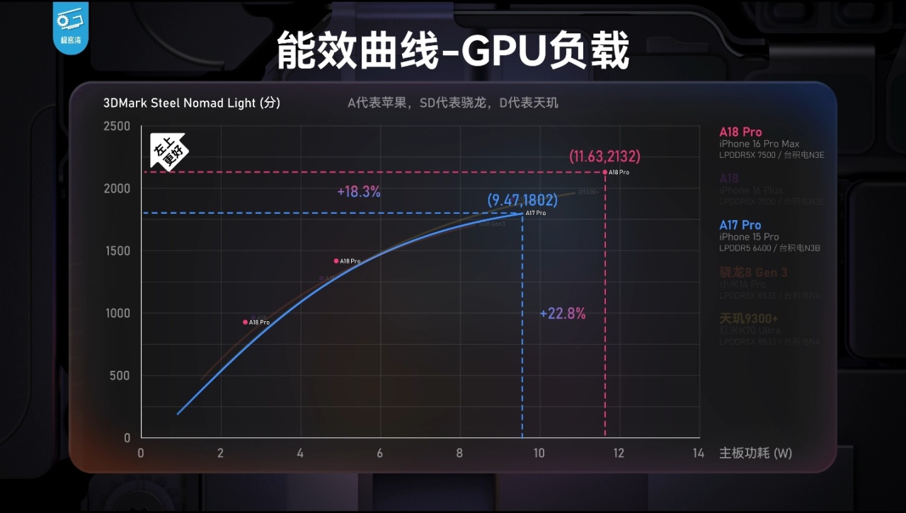 ◆ A18 Pro于该项目中,相较前代性能提升约18%,能效全频段领先;