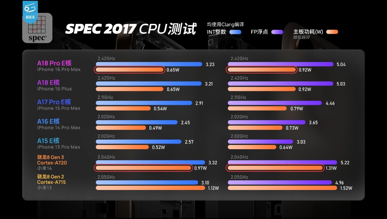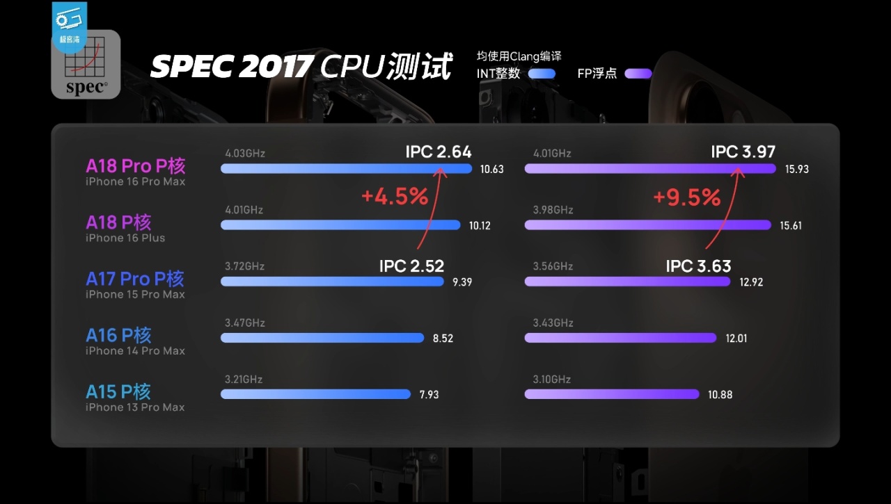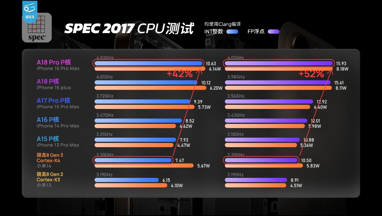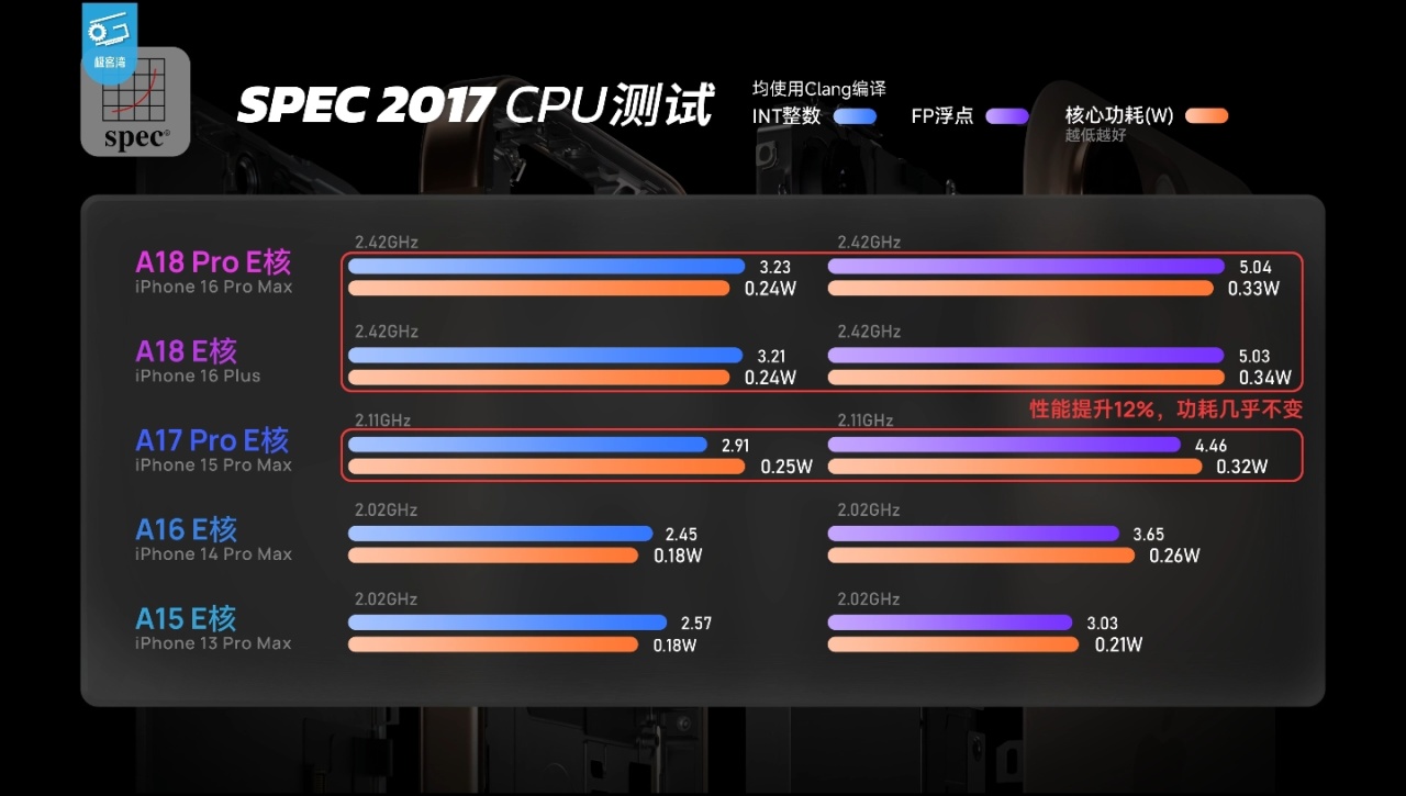 ◆ A18 Pro•P核,整数约10.63分/6.14瓦,相较前代性能提升约13%;