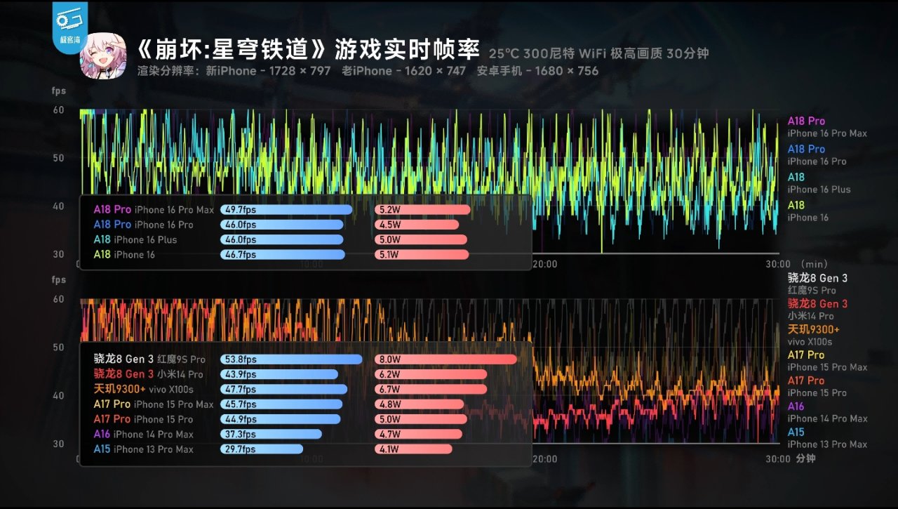 ◆ A18 Pro于该项目中,平均帧率最高49.7帧,功耗5.2瓦;