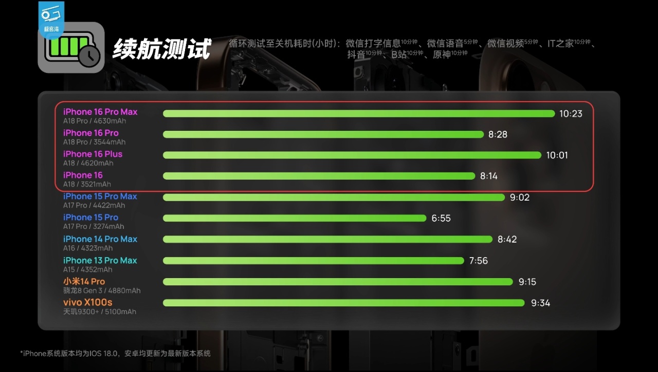 ◆ 就现有续航模型下,iPhone 16全系续航相较前代大幅增强!大屏机型均可维持10小时以上续航,小屏机型均可维持8小时以上续航!