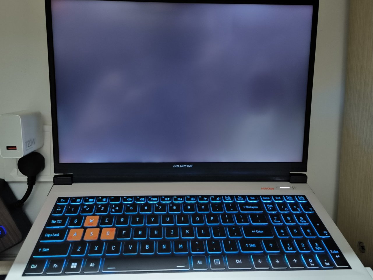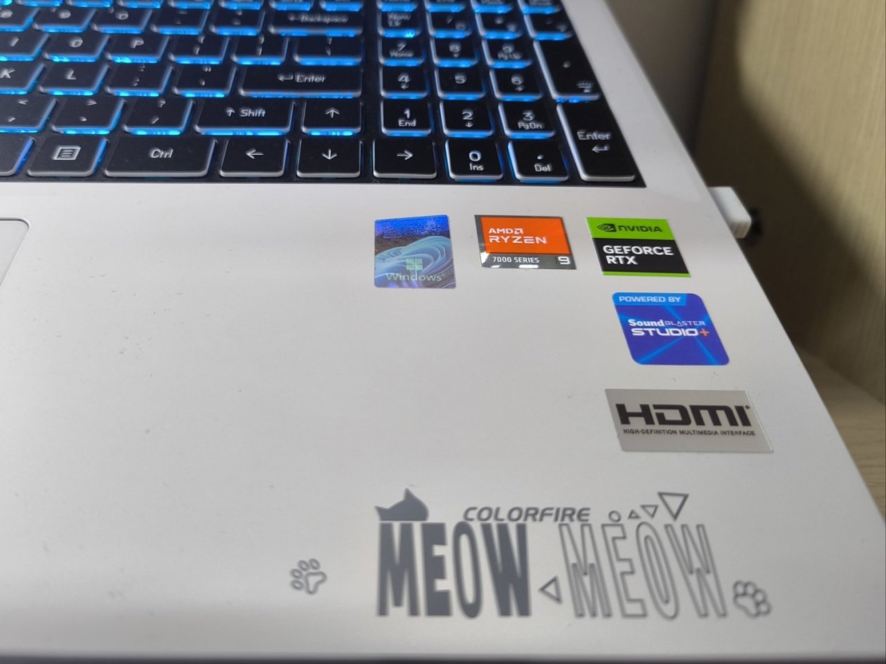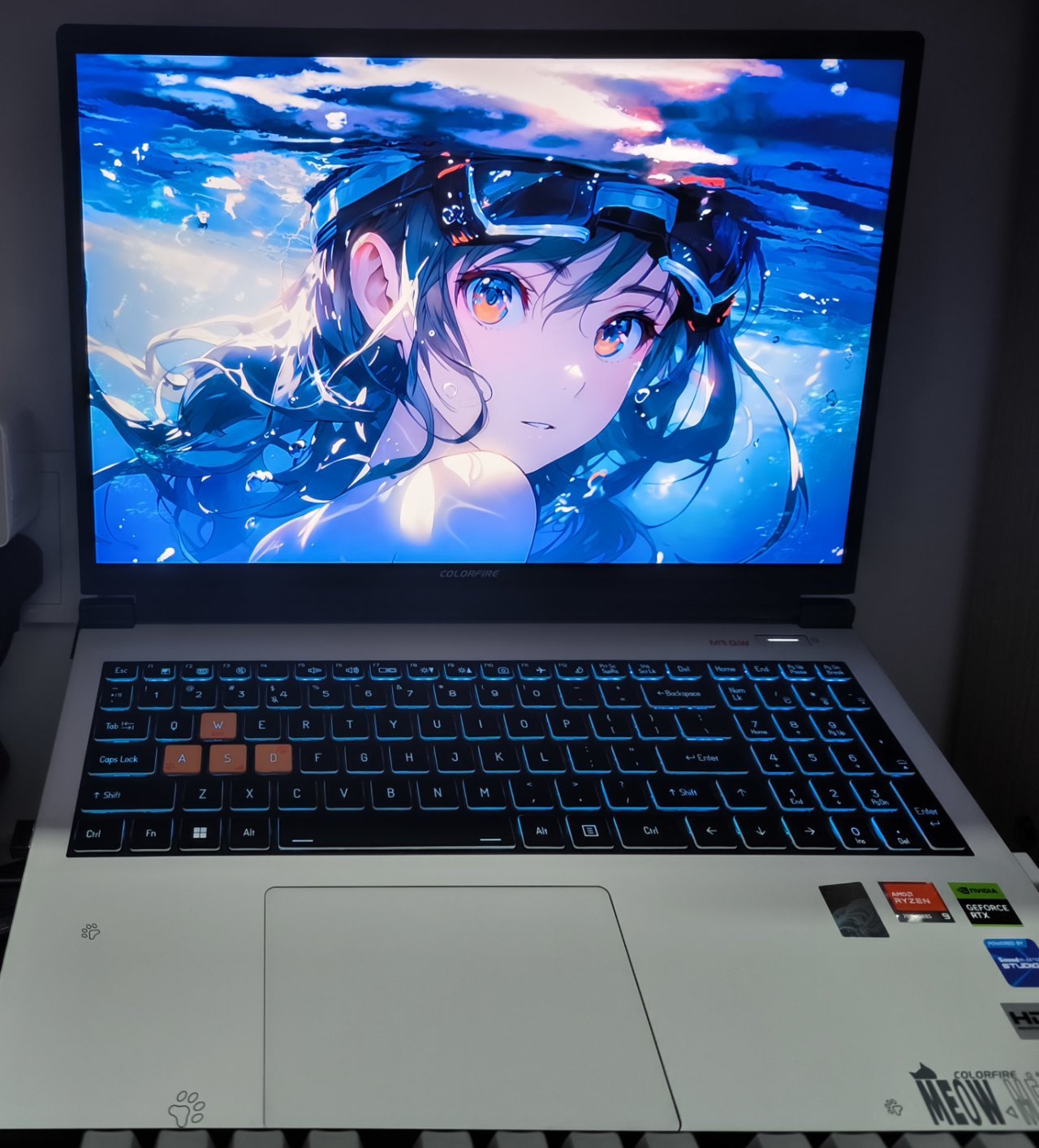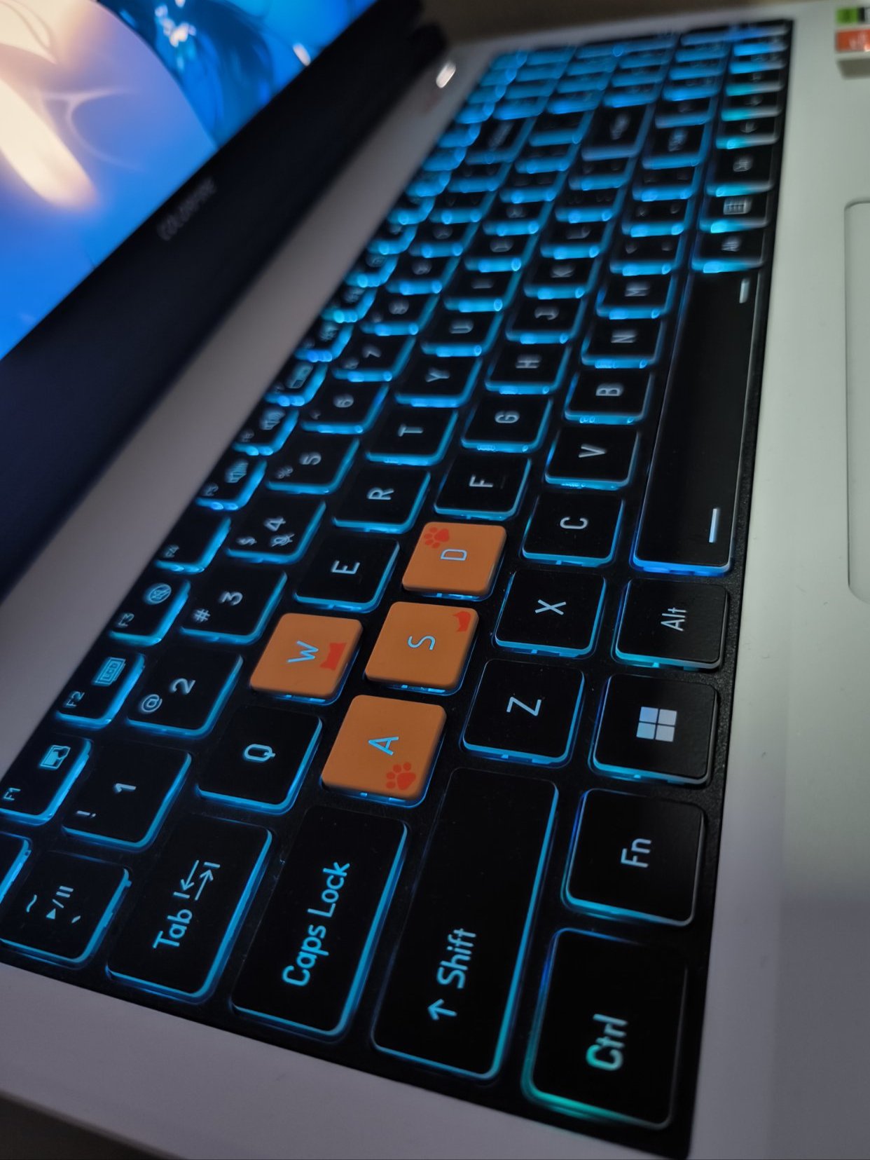 整體筆記本還是藍天的模具,鍵盤是RGB背光,可在系統自帶的 control center 自定義調節,個人覺得也是挺好看的,但是鍵盤打遊戲啥的個人感覺就不是很舒服了,建議還是外接一個鍵盤。就整體質感來說並不優秀,全機身塑料材質,而且總感覺有種很空的感覺,屏幕和觸摸屏附近很空很脆,感覺很容易損壞,但是由於配色優秀並不會讓人感覺很廉價。