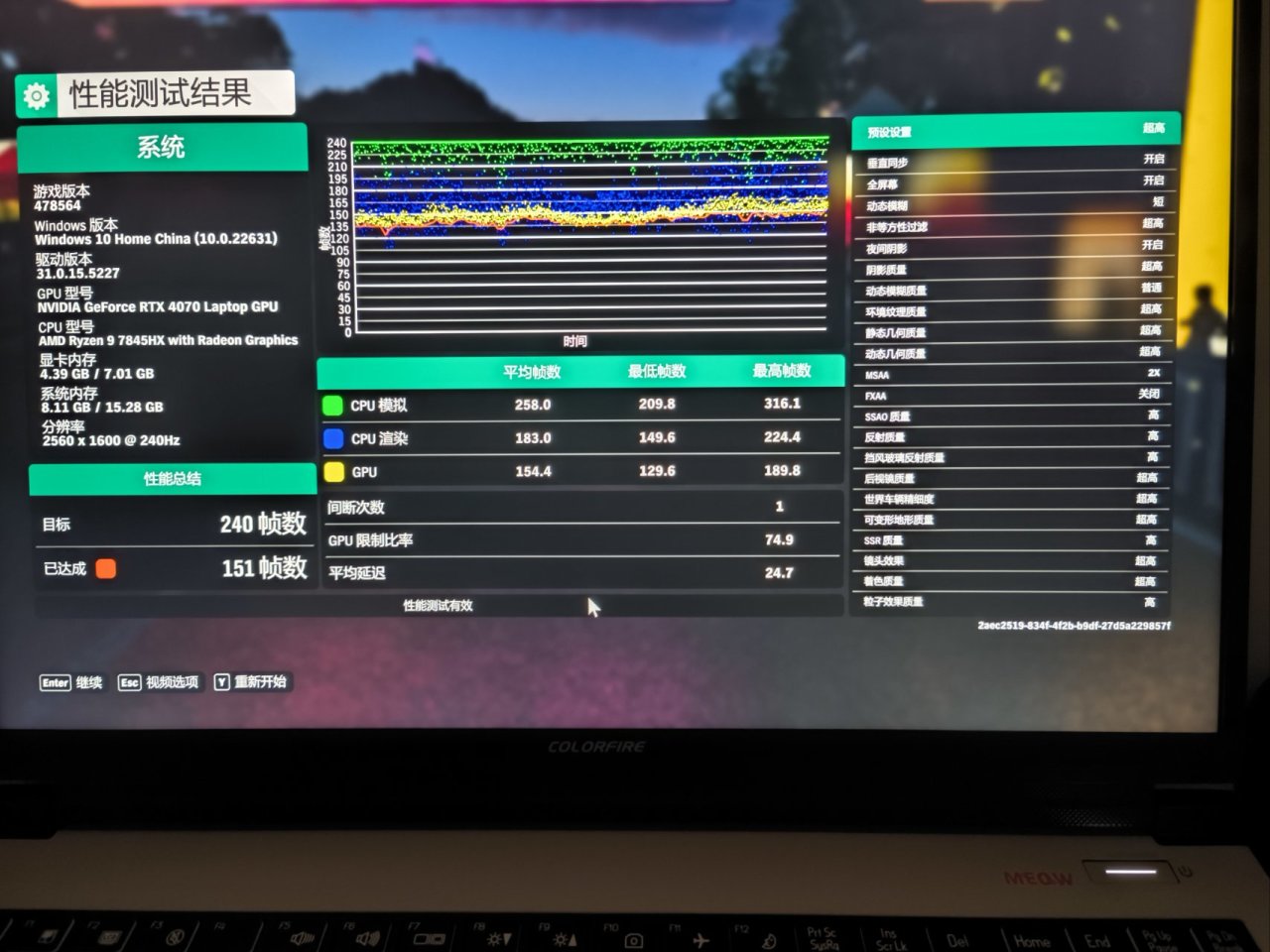 性能問題應該是大家最關注問題了,因爲本人並非專業測評對於特別精準的數據作者沒做提供 。就個人感受來說,這款筆記本4070顯卡,相比上一代來說升級230w電源,基本上通殺市面上的3a大作和網遊了,csgo全最高畫質300幀沒問題,地平線全最高畫質評論200幀以上,黑神話悟空超高畫質,2k分辨率90幀左右,永結無界本人不玩其他沒做具體測試,但是實際遊戲方面基本沒有壓力(如圖是地平線四性能測試)