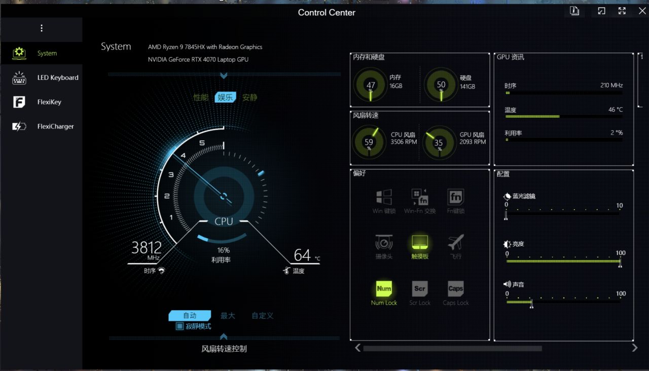 個人感覺七彩虹這款筆記本就是標準的遊戲本,重量2.3kg相對其他遊戲本來說這個重量中規中矩。該筆記本並不帶人臉識別、指紋解鎖等功能,這點本人也不太在意,畢竟對於遊戲本也可有可無。最讓本人詬病的是還是這款筆記本的揚聲器,真的就聽個響,不過鍵盤、揚聲器都可以通過外設解決。值得一提的是,這款筆記本的散熱特別好,重度遊戲三四個小時,筆記本表面不會感到明顯燙手,但是取而代之的是風扇的噪音很大。還有一個特色就是這款筆記本的 control center系統有很多功能,風扇噪音問題也可以通過這調節(安靜模式下其實噪音基本聽不見)。