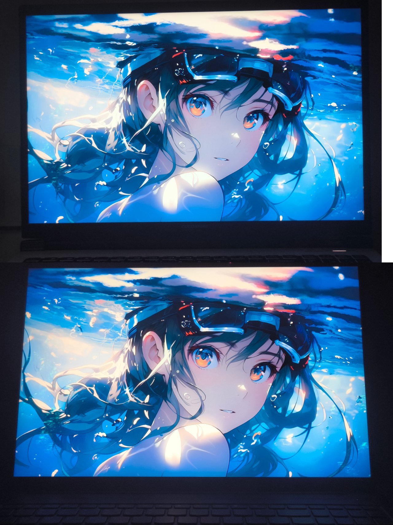 相信大多數人對屏幕問題都很在意,首先16英寸16:10的屏佔比給人看起來很舒服,打遊戲很爽,240hz高刷相比144hz其實相比提升並不大。比較嚴重就是漏光問題,這款筆記本漏光問題還是有的,不過漏光基本上是現在市面上ips屏幕的通病了,也就是在全黑屏的狀態下比較明顯,本人對此並不是特在意也就算了(主要也是怕換貨換到更拉胯的)。其次本人這款筆記本運氣不太好是天馬屏,很多盒友應該對天馬屏和其他屏幕的區別很好奇,爲啥很多人對天馬屏評分不太好,這裏就作者個人感受做個解釋(不太專業,有大佬可以補充),首先天馬屏就作者個人感受在黑暗條件下很刺眼,其次就是在色域調節和高光方面確實和其他屏幕能看出來差別,但實際體驗下來差別並不是特別大(如下圖,上爲天馬屏下爲京東方屏,從臉部色域和肩膀高光應該能比較明顯看出)。