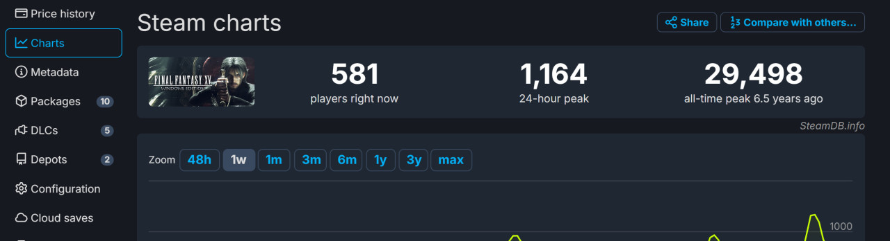 但不及6年前的《最終幻想15》,後者Steam在線峯值29498人: