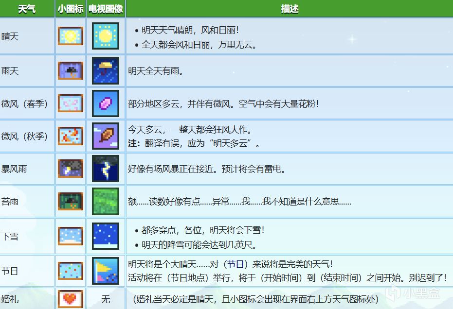 ①天氣預報頻道能告訴玩家第二天的天氣。使用雨水圖騰後,天氣報告將更新其預測。