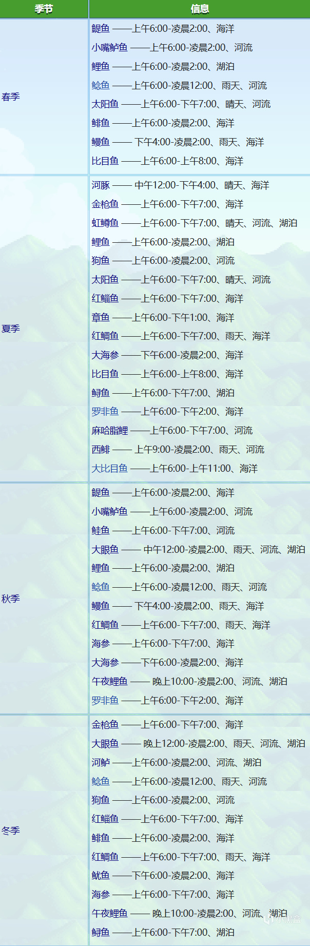 提供當前季節可捕獲魚類的相關信息,包括釣魚的種類、時間、天氣和位置的要求