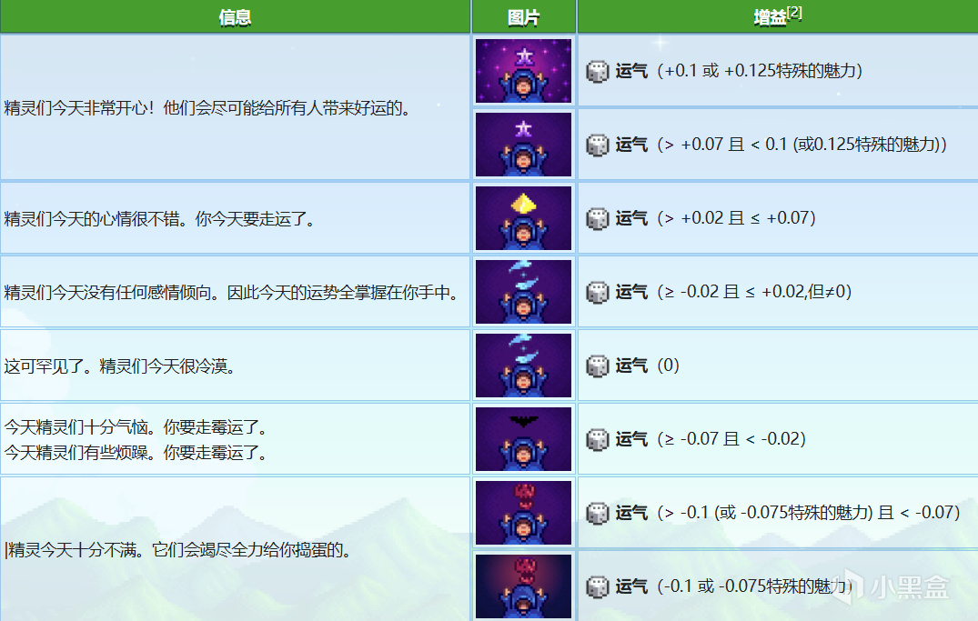 ②運氣的影響主要體現在採礦和釣魚兩個方面,運氣可分爲每日運氣和運氣增益兩種。