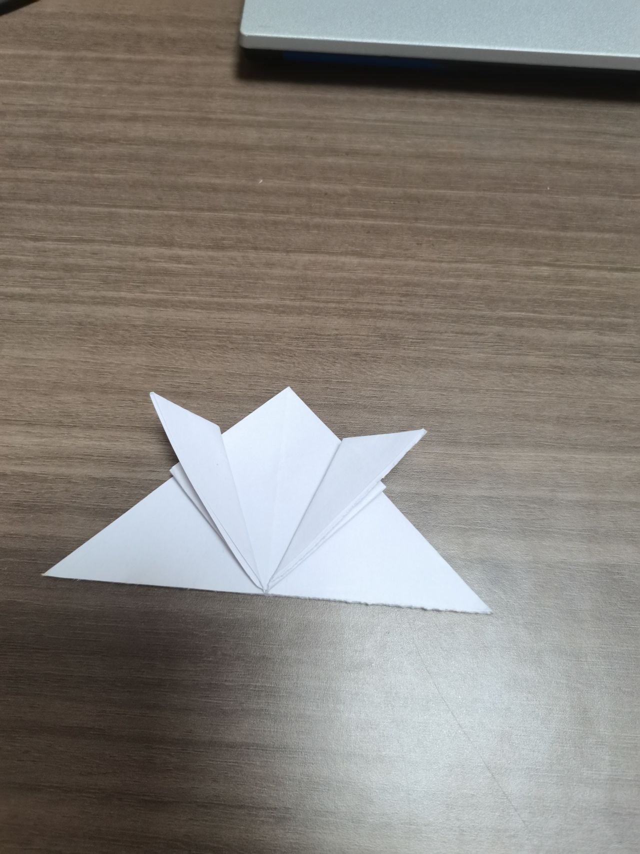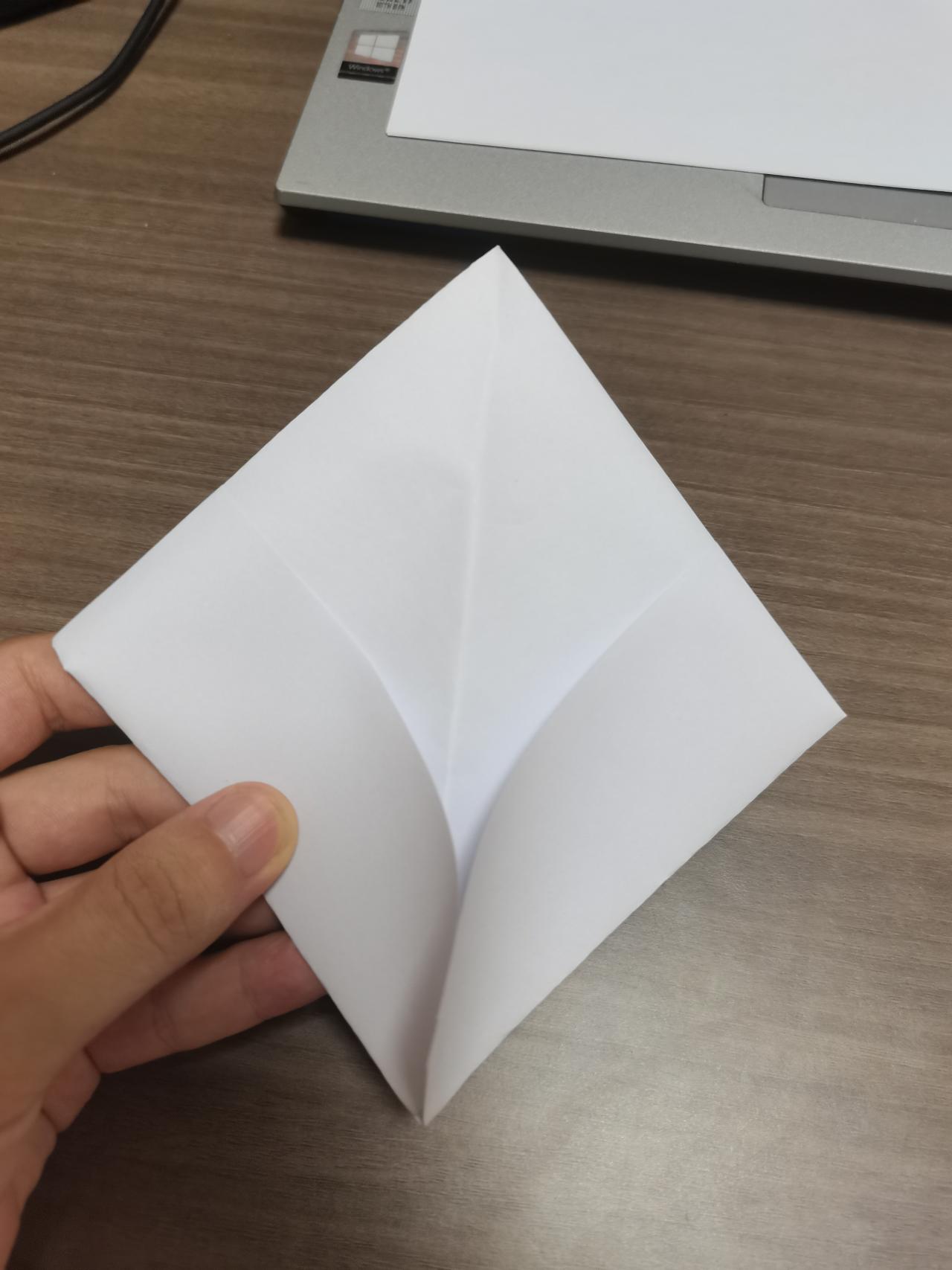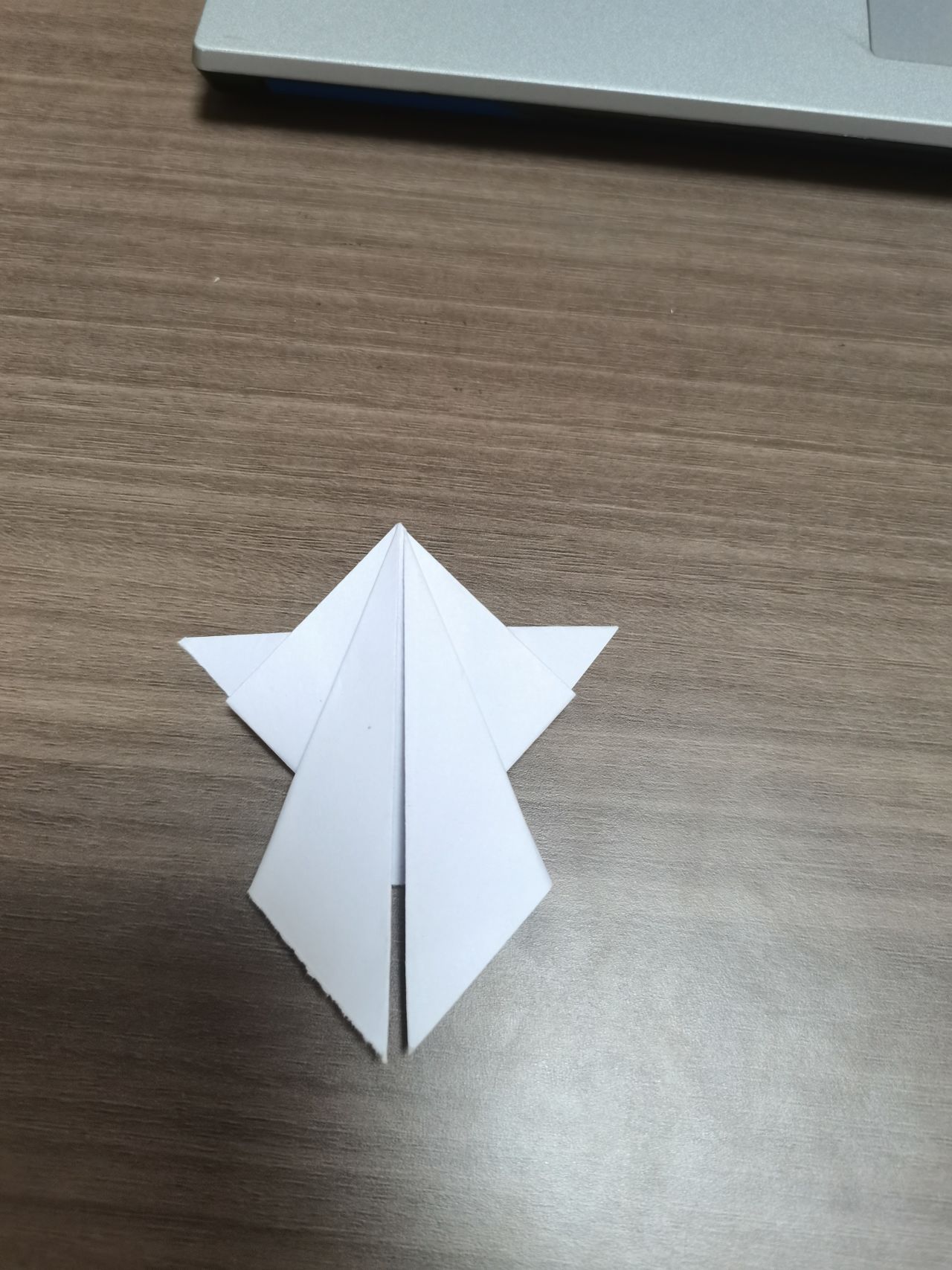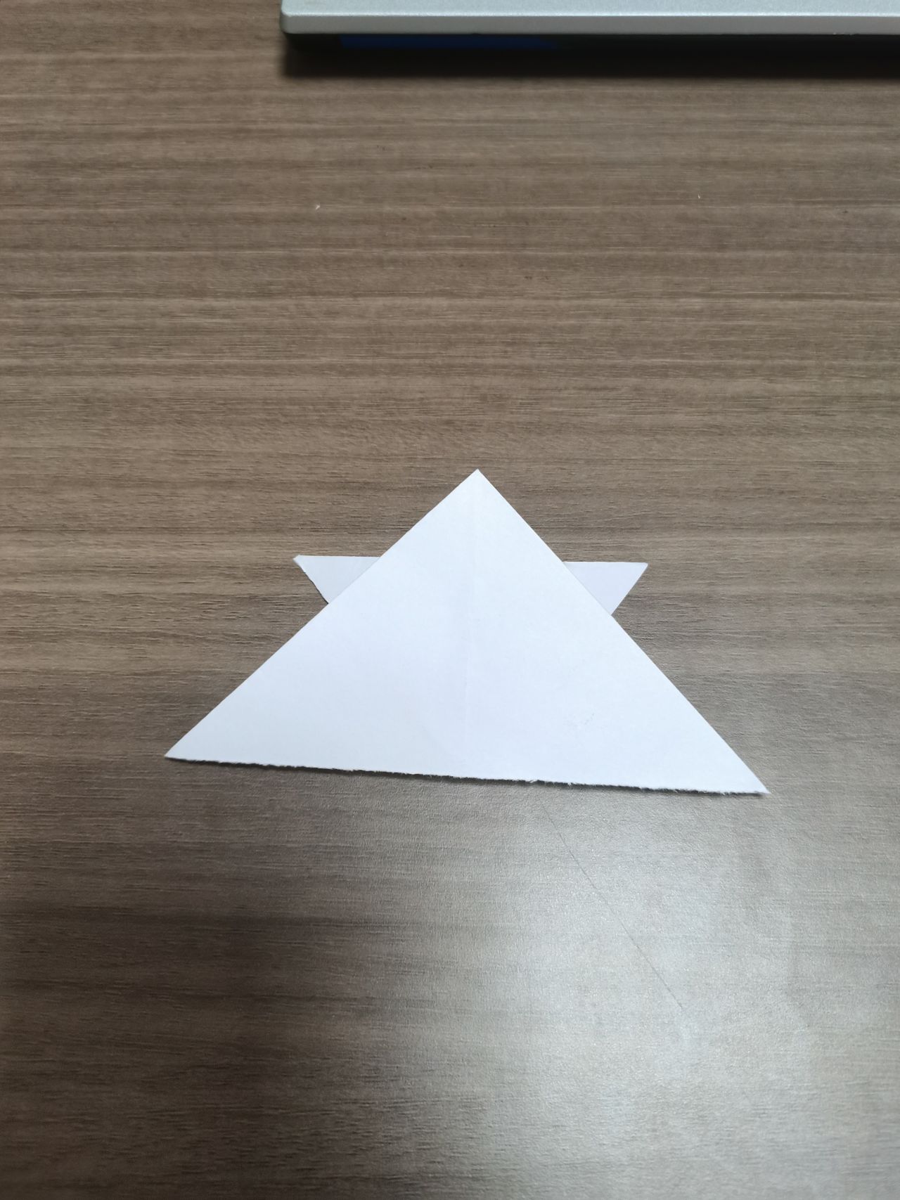 5.將兩角斜着折向中線某點,留一個“尖尖”