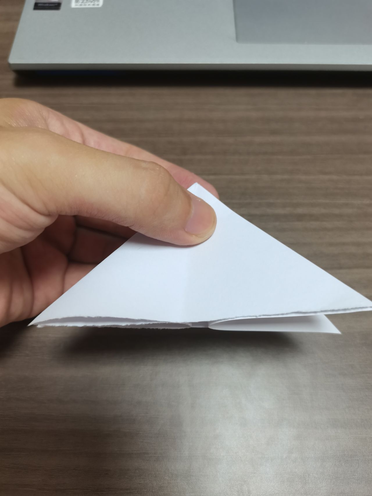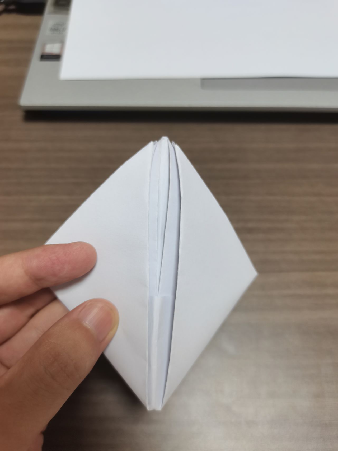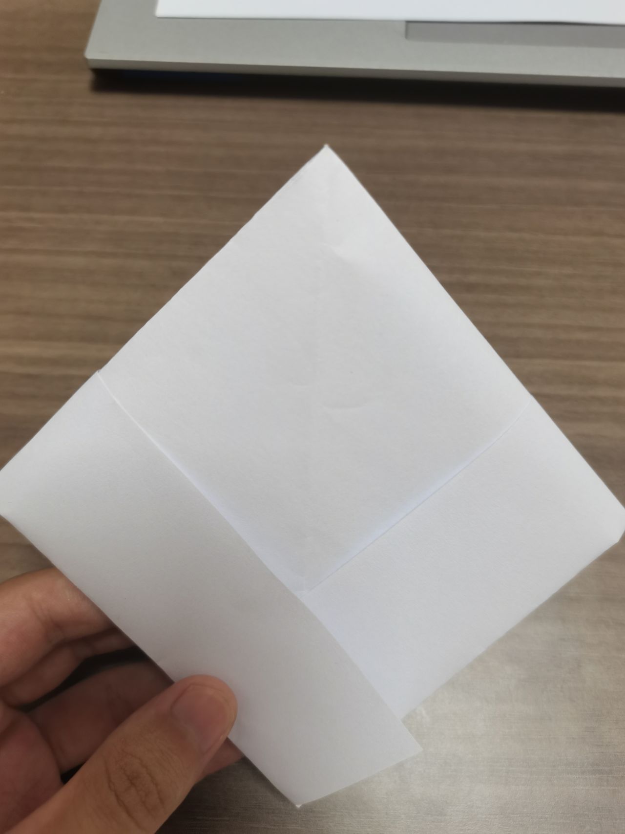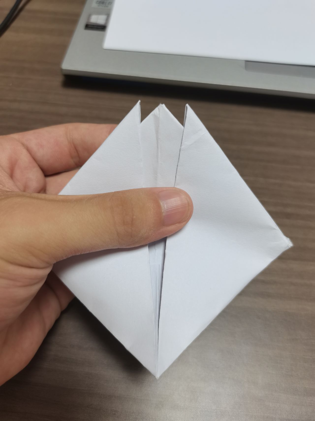 5.將兩角斜着折向中線某點,留一個“尖尖”
