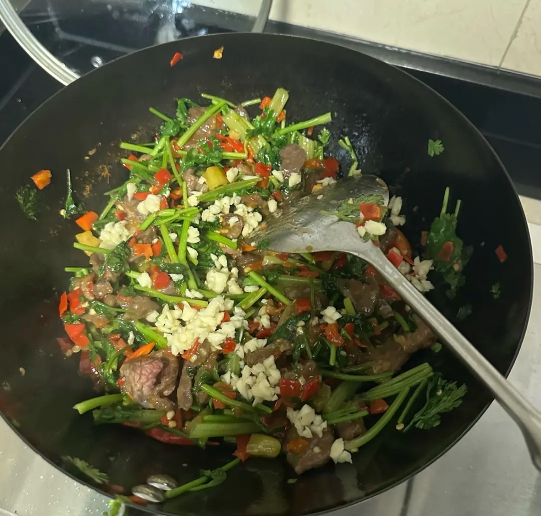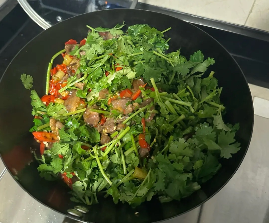 6.放入香菜、小米辣、香芹、一勺生抽、少許鹽和味精,大火翻炒