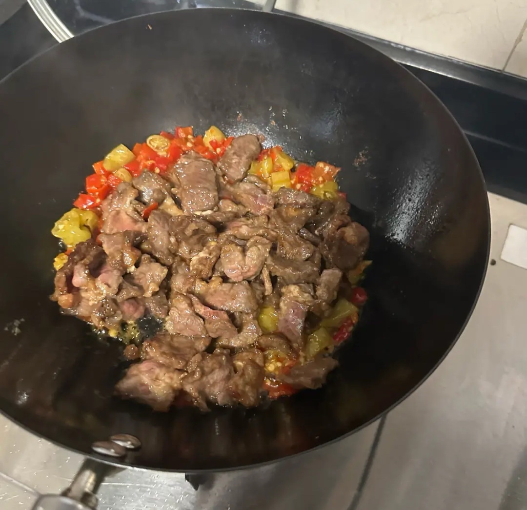 2.熱鍋多油、之後下入牛肉片,定型後再翻炒