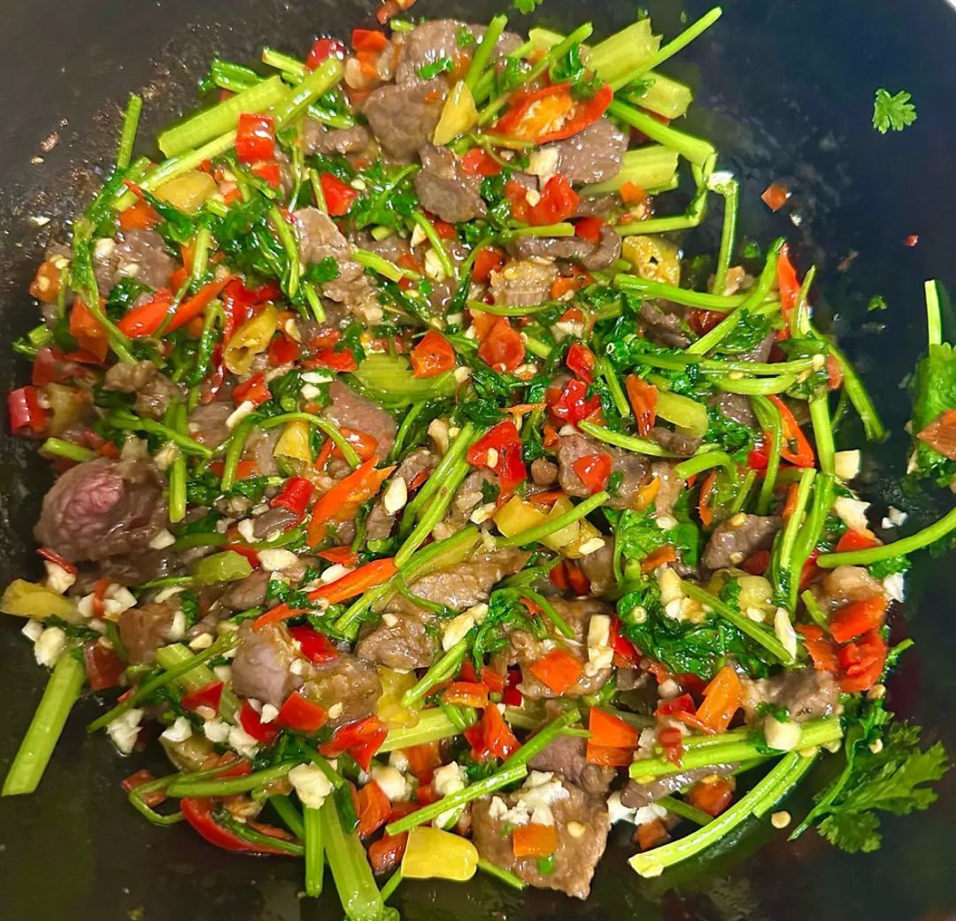 1.牛肉切小片用蠔油、生抽和澱粉研製半小時,泡椒切小,兩勺剁椒醬、香菜和芹菜切小段,小米辣切細備用
