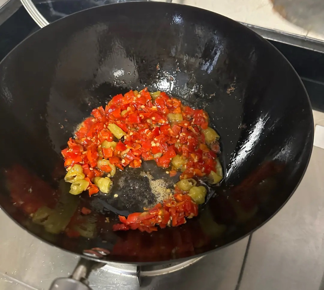 4.鍋中繼續倒油,放入剁椒醬和泡椒碎炒出香味,全程中小火