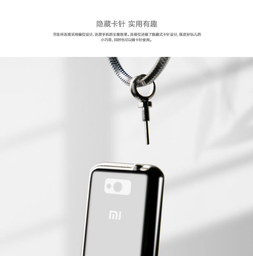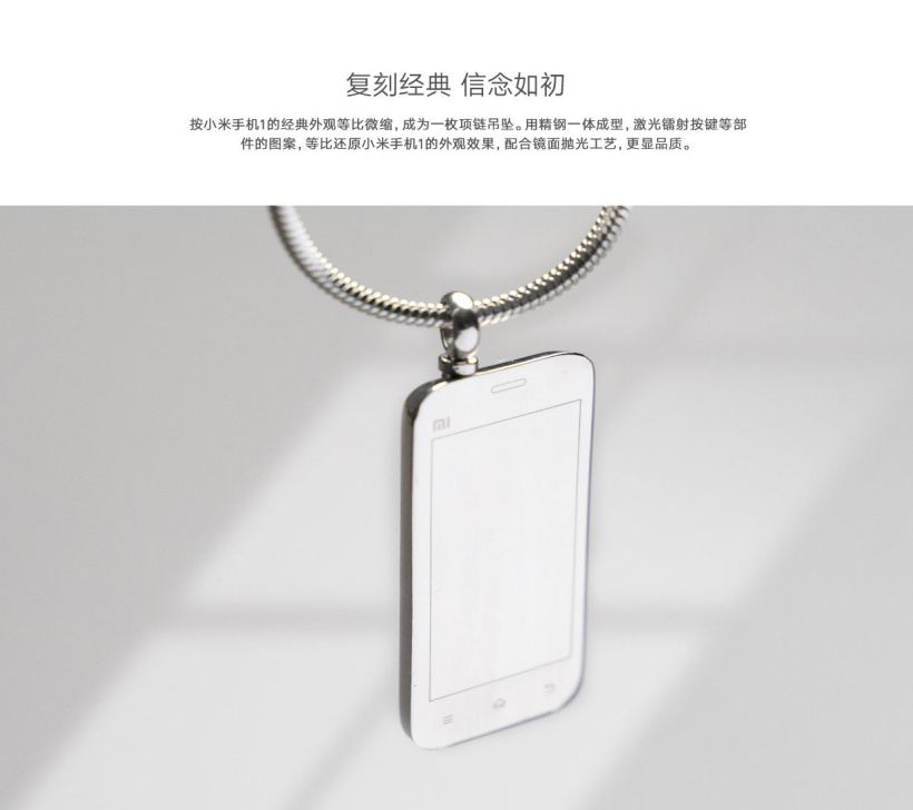 IT之家瞭解到,據官方介紹,該吊墜按小米手機 1 的經典外觀等比微縮,成爲一枚項鍊吊墜。用精鋼一體成型,激光鐳射按鍵等部件的圖案,等比還原小米手機 1 的外觀效果。