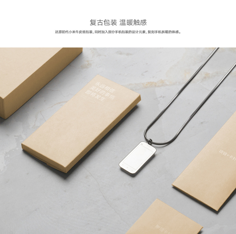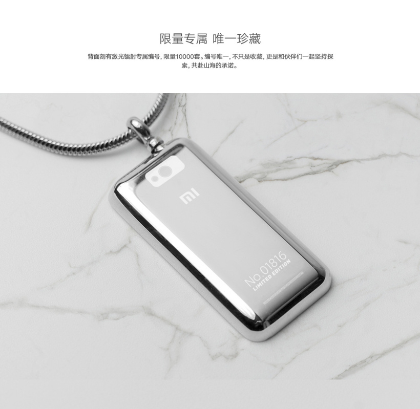 該吊墜採用不鏽鋼打造,背面刻有專屬編號,限量售賣10000 套,重量 30g,尺寸爲 37.5mm*18.9mm*3.6mm,樣式與小米手機 1 相同。