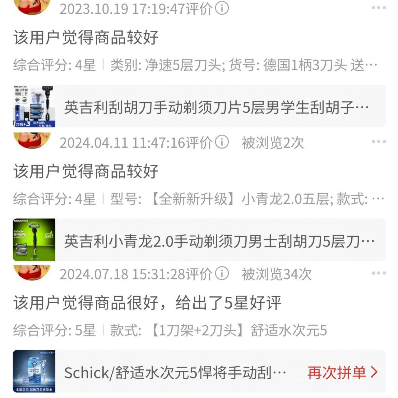 剛開始貪便宜,看着昂貴的吉列,就隨便買了一款英吉利的!每次都要塗體恤膏!還經常刮破!很糟心!好像二十多塊錢!
