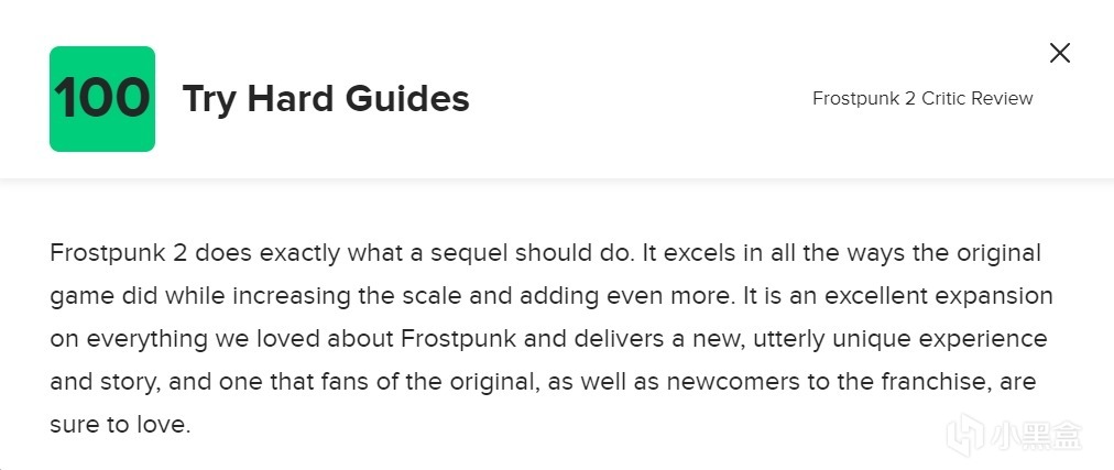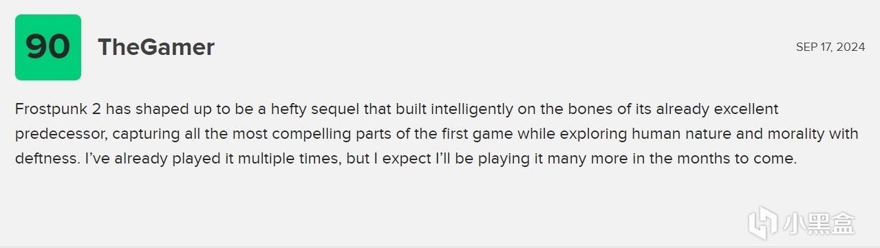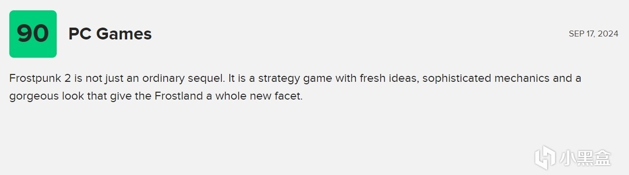 大意:《冰汽時代2》完全符合續集的要求。它繼承了原作的所有優點,同時擴大了規模,增加了更多內容。它出色地擴展了《冰汽時代》的所有魅力,帶來了全新的、完全獨特的體驗和故事,原作粉絲和新玩家一定會愛上這款遊戲。