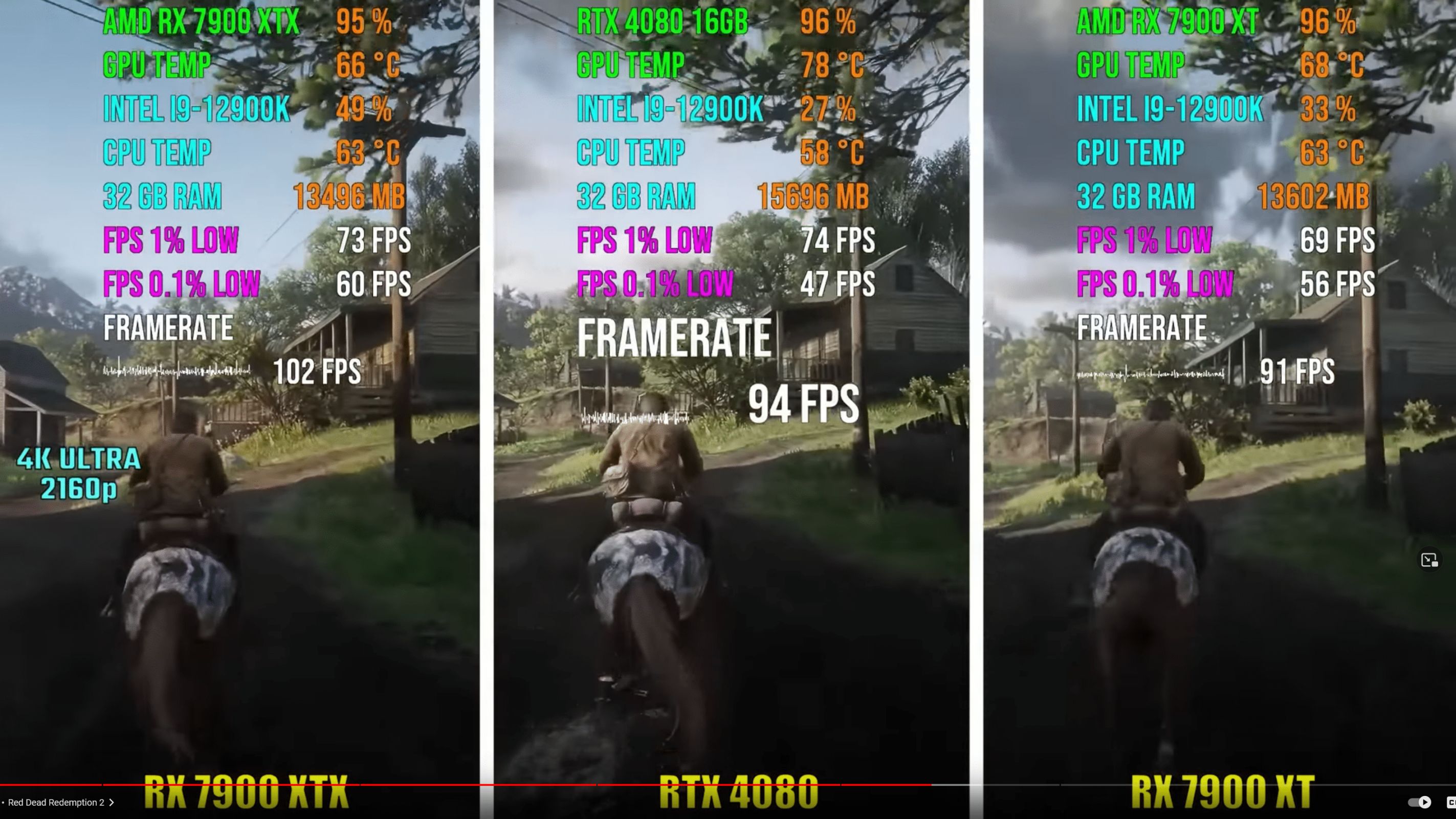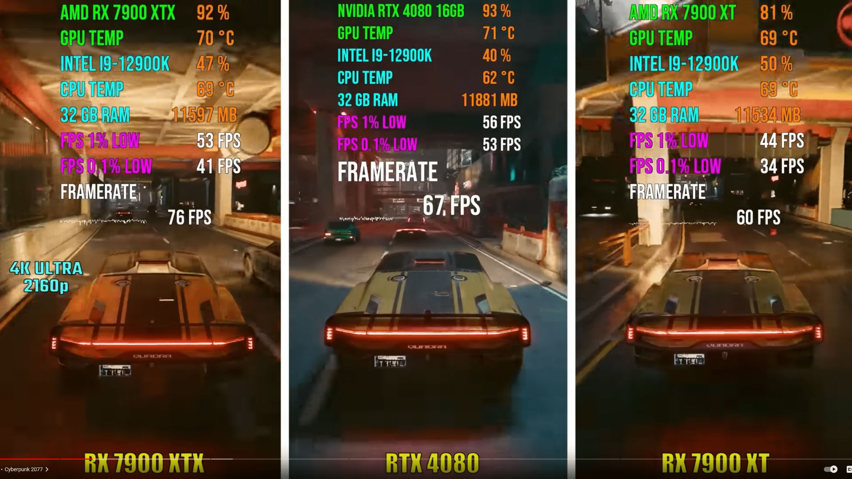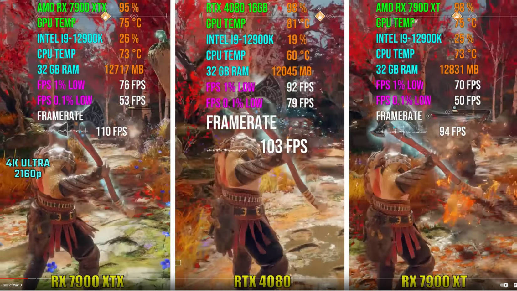 除此之外,在实际的游戏性能上,根据国外博主Mark PC的测试,在《毁灭战士》、《战神》、《荒野大镖客2》、《赛博朋克2077》中,RX 7900XTX均是领先了RTX 4080,平均达到了15—20帧。而RX 7900XT,则是落后RTX 4080 10帧左右。