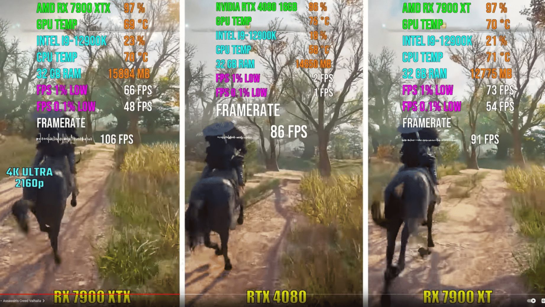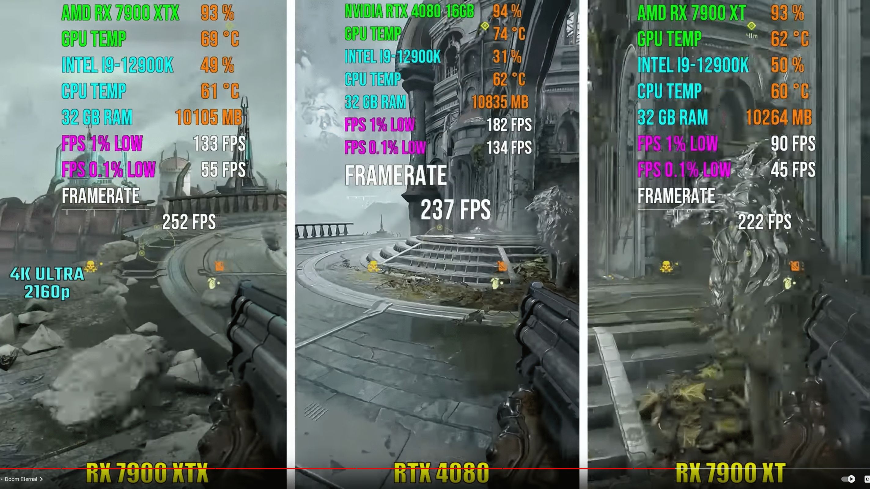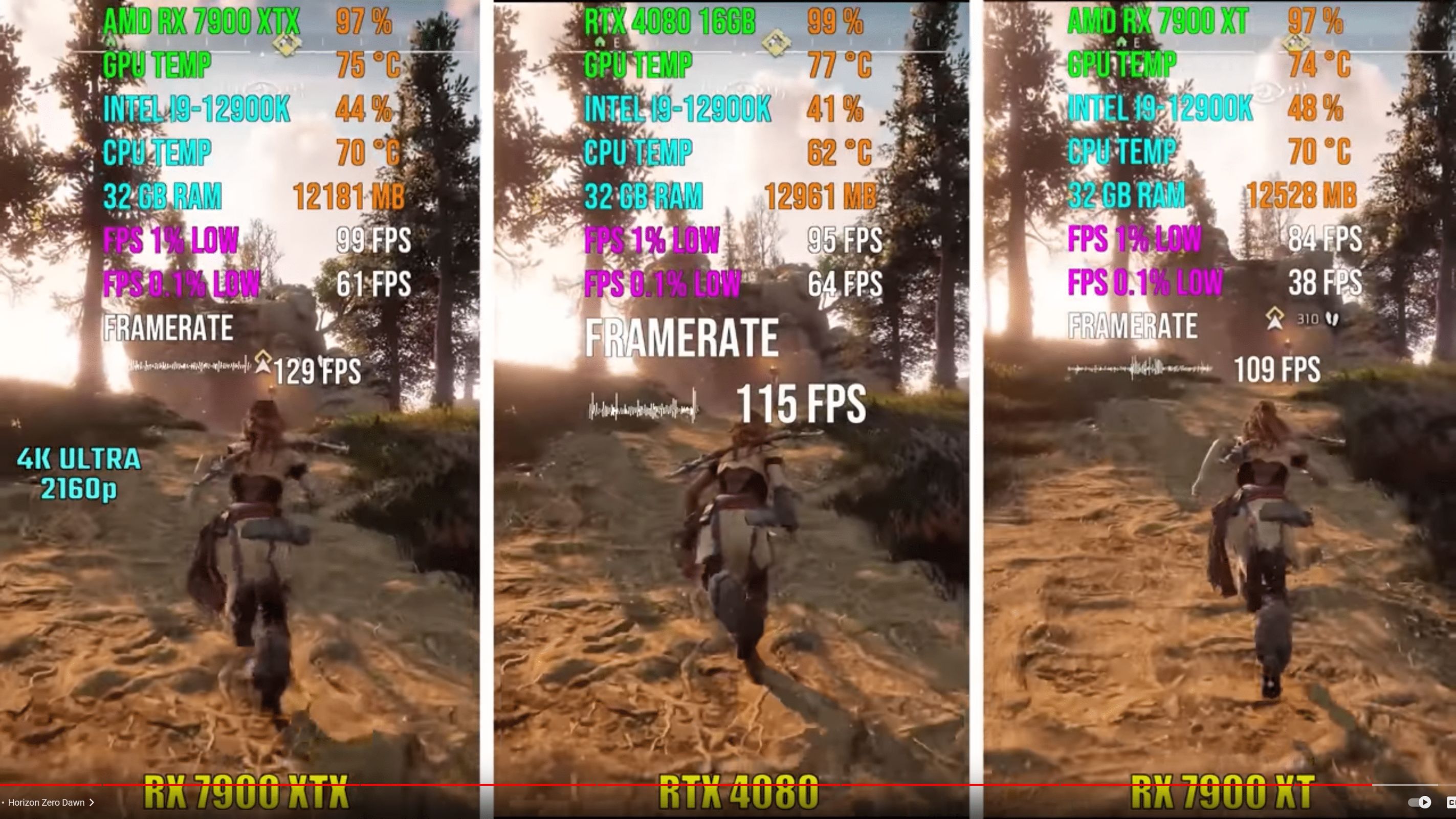 除此之外,在实际的游戏性能上,根据国外博主Mark PC的测试,在《毁灭战士》、《战神》、《荒野大镖客2》、《赛博朋克2077》中,RX 7900XTX均是领先了RTX 4080,平均达到了15—20帧。而RX 7900XT,则是落后RTX 4080 10帧左右。