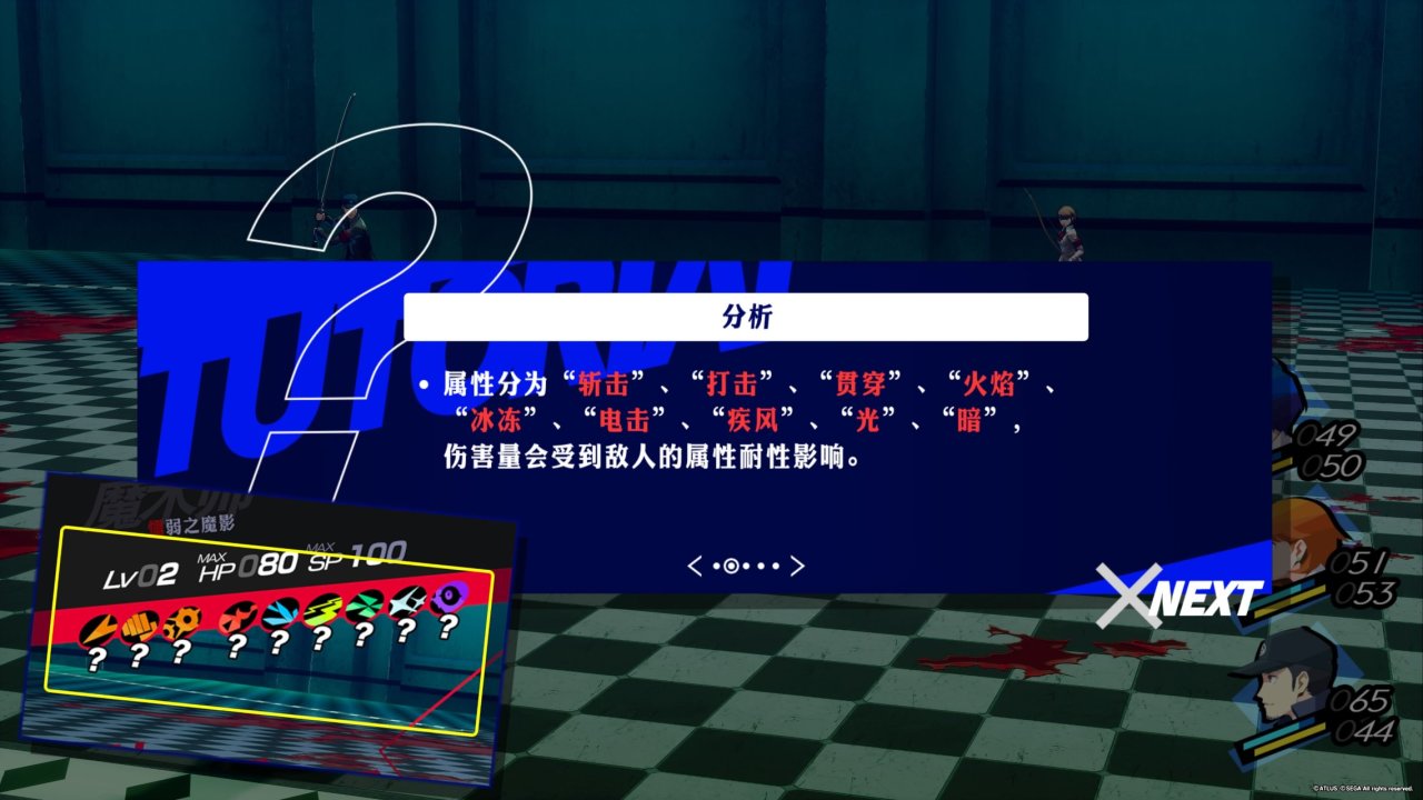 在回合制战斗中,策略性的重要性体现了出来。游戏有多种属性,其中敌人与角色自身一般都会对某些属性有属性耐性,反弹属性,无效等等。同样的也有弱性属性,我方则是队友与主角的persona属性耐性或弱点。