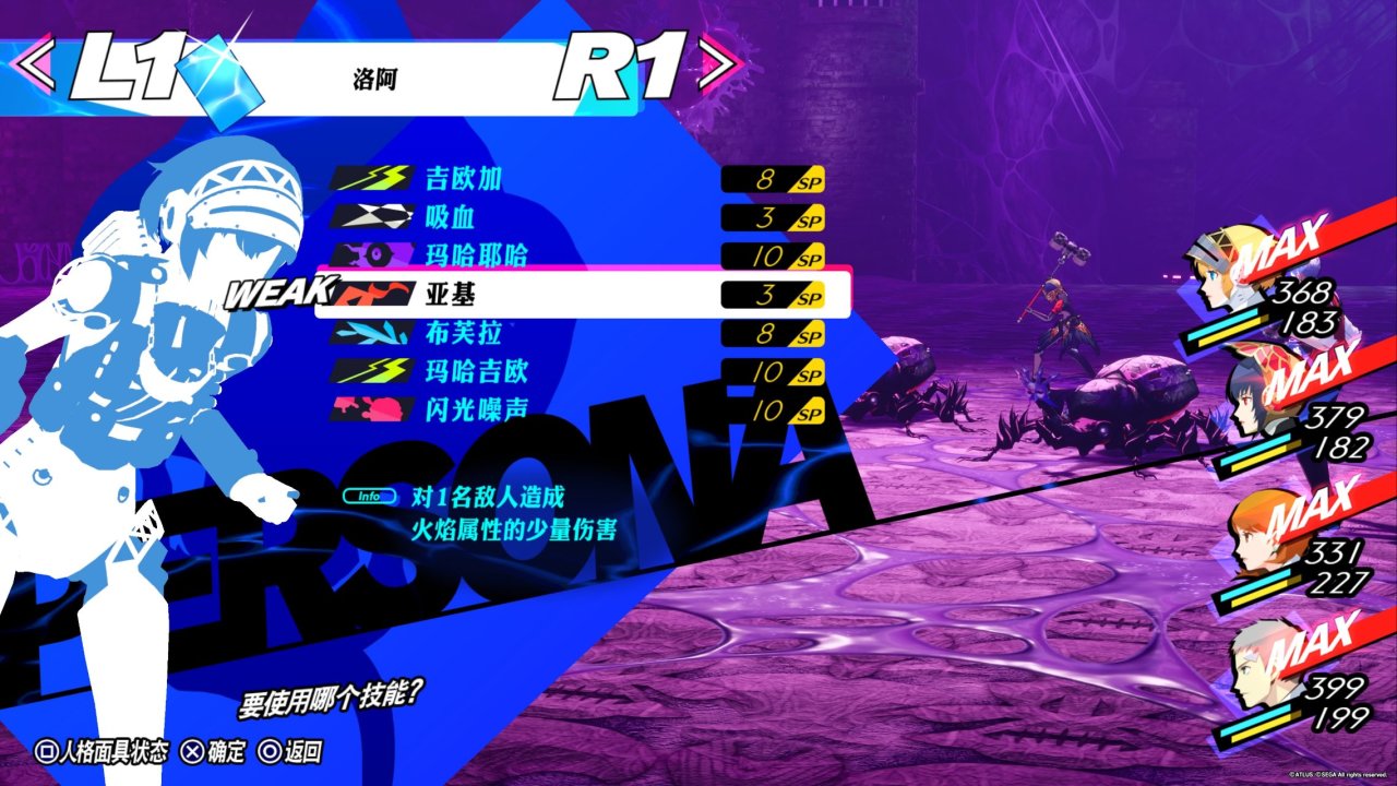 游戏的战斗是JRPG回合制那一套玩法,游戏的战斗也同样通俗易懂。战斗时角色的基本行动指令总共分为攻击,技能,防御,道具四种,其中技能方面主要围绕着角色各自的persona展开。