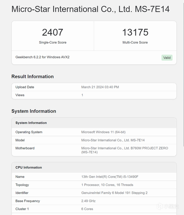 GeekBench 6基准测试结果显示,Intel Core i5-13490F处理器在单核性能测试中获得2407分,而在多核性能测试中则取得了13175分,彰显了其出色的性能表现。