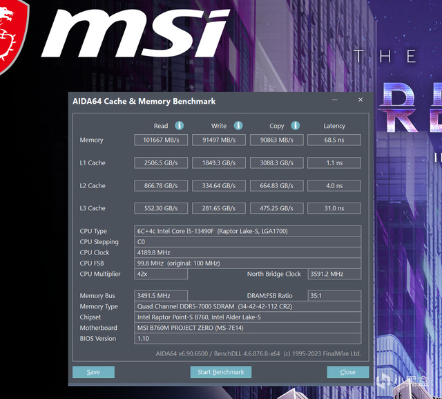 在AIDA64的内存与缓存性能测试中,所测内存配置的时序参数设定为34-42-42-112 CR2。具体表现如下:读取速率达到101667MB/s,写入速率则为91497MB/s,而复制操作的速率为90863MB/s。此外,测试结果显示其访问时延为68.5ns。