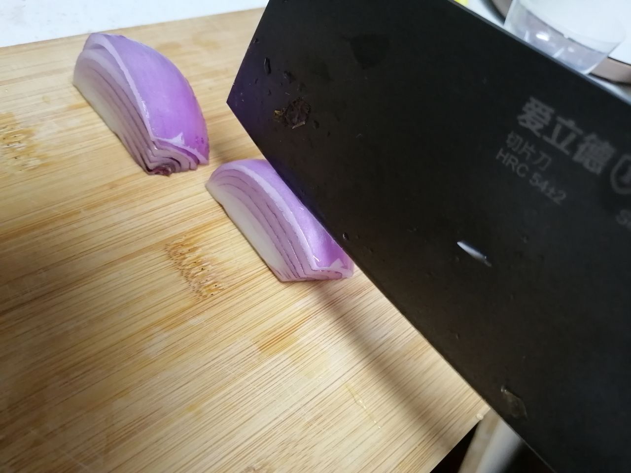这里建议新手宝宝直接用我切洋葱的小技巧:放一盆水在旁边,每切一刀,都把刀放进旁边的水盆里沾一次水,这样绝对能最大程度缓解辣眼睛的问题,老手耐受度比较高的话可以跳过了哈