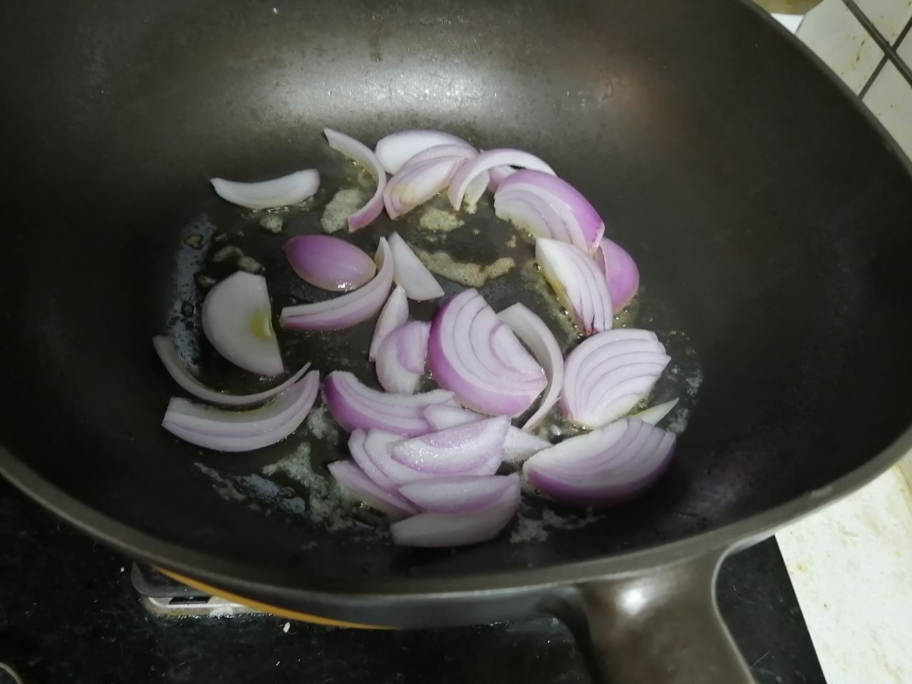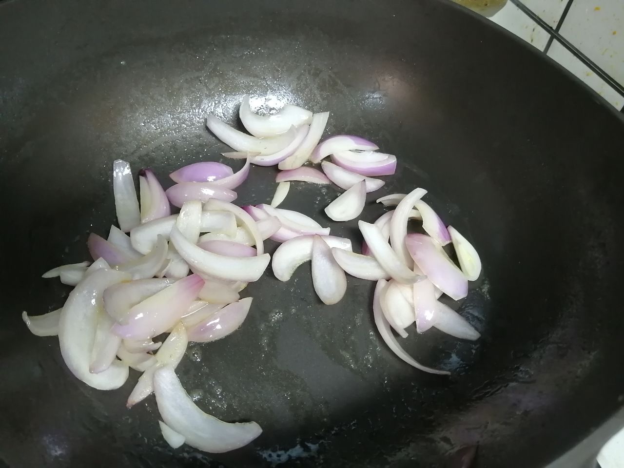 这次我们把锅烧热,倒入油之后,要尽快把洋葱加入锅中,因为这次的洋葱上沾了好多水,如果油温烧热了再倒进锅里的话油会跳起来打你的