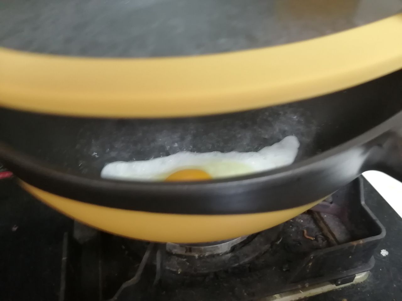 这时候你会发现,刚刚被拉高温度的油跟水混合后,水会进入一个暴沸状态,此时盖着锅盖,就可以聚集大量的高温水蒸气,在底部加热的同时,高温水蒸气会把蛋的表面也给闷熟