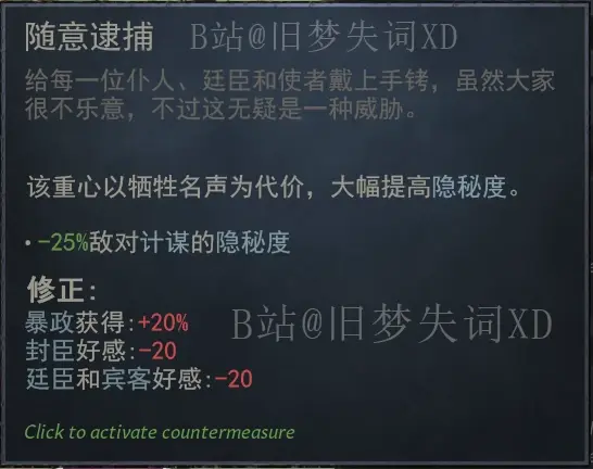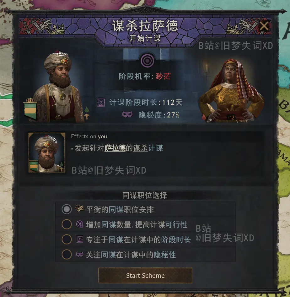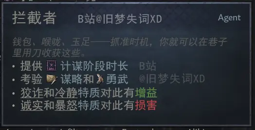 在计谋开始时,玩家可以选择不同类型的同谋职位,比方说有助于成功机率的、侧重于推动计谋速度的、提高隐秘度等等,玩家需要以成功与保密为考量,选择合理的职位分配。我们最初尝试在事件选项中添加随机时效的随机的同谋职位,让玩家自己选择,但是经过测试之后我们发现这会很冗杂,所以我们决定放弃随机性,让玩家自己决定同谋职位。