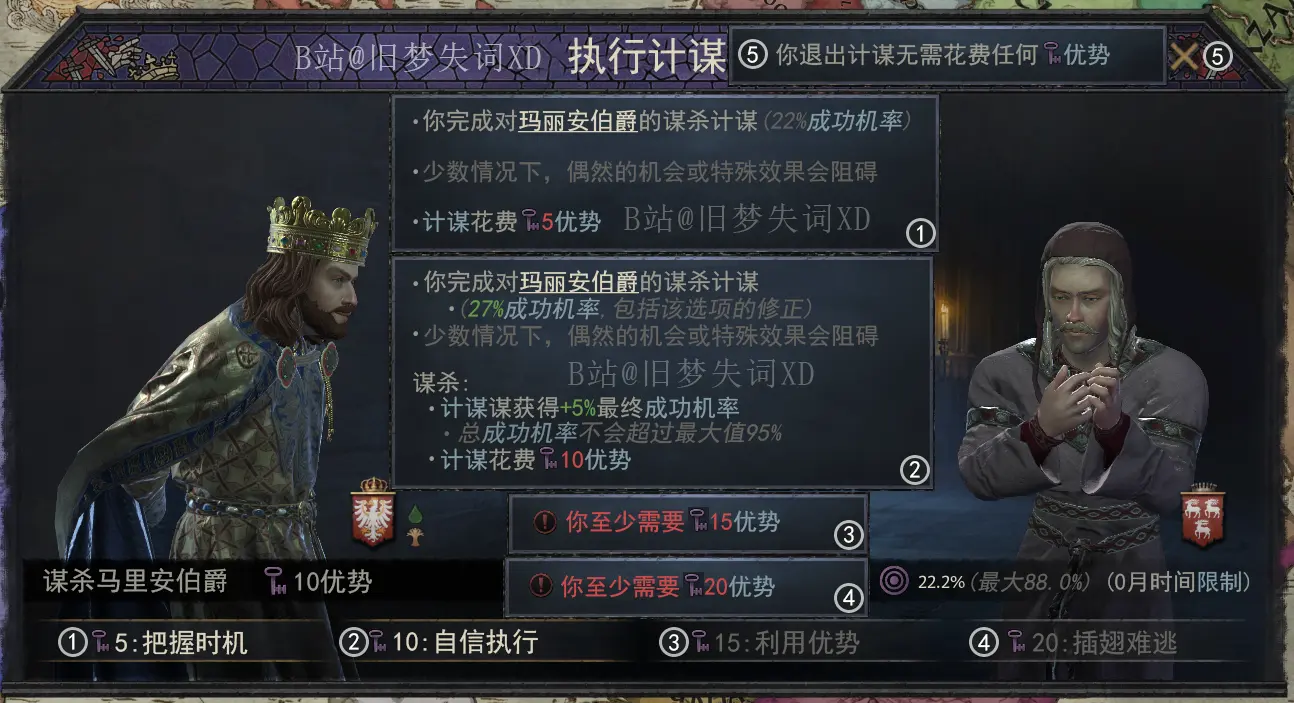 这需要玩家根据具体情况具体分析,比方说如果目标率领千军万马直逼城下,你还会赌60%的成功机率吗?我应该先谋害敌对高优势的指挥官还是棘手的配偶?我还有几次机会被发现并最终计谋破产?