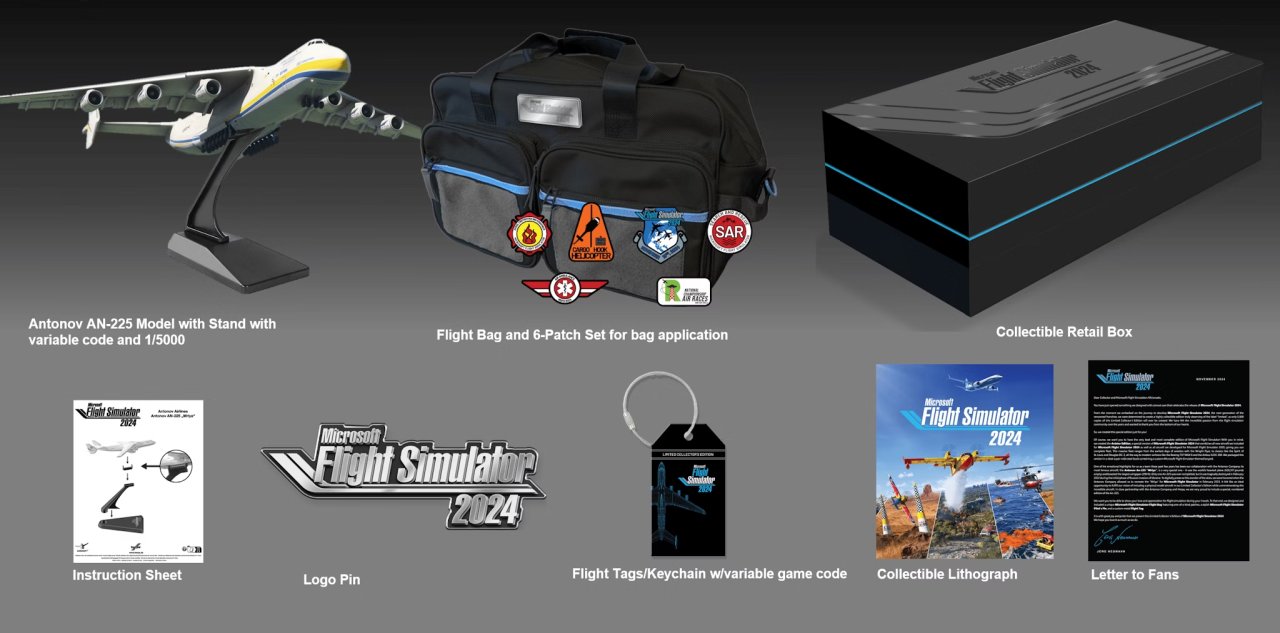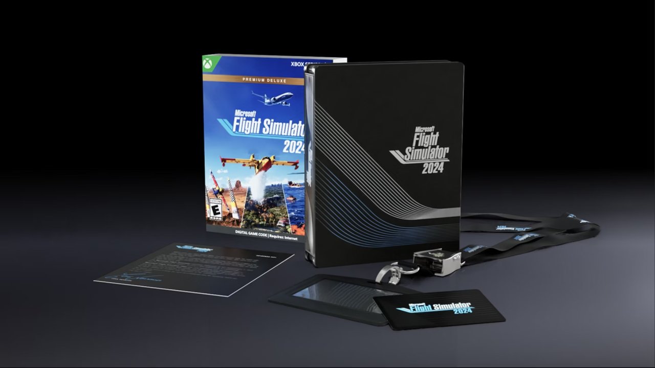 限量版巨型鋼盒套裝:內含《微軟飛行模擬 2024:飛行員版》及高級豪華版的全部內容,更獨家收錄2021至2024年間微軟發佈的30架市場飛機完整機隊。此外,還特別附贈定製飛行員掛繩,連接至仿皮革身份證徽章夾,內含遊戲兌換碼。