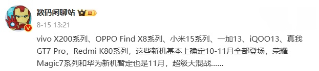 根據目前掌握的信息,即將到來的10月至11月將成爲各大手機品牌發佈新機的高峯期。除了小米15系列之外,vivo X200系列、OPPO Find X8系列、一加13、iQOO13、真我GT7 Pro,以及Redmi K80系列等新機也均已基本確定將在這段時間內悉數登場。這些新機型的集中發佈,將爲消費者帶來更爲豐富的選擇,同時也將加劇手機市場的競爭態勢。