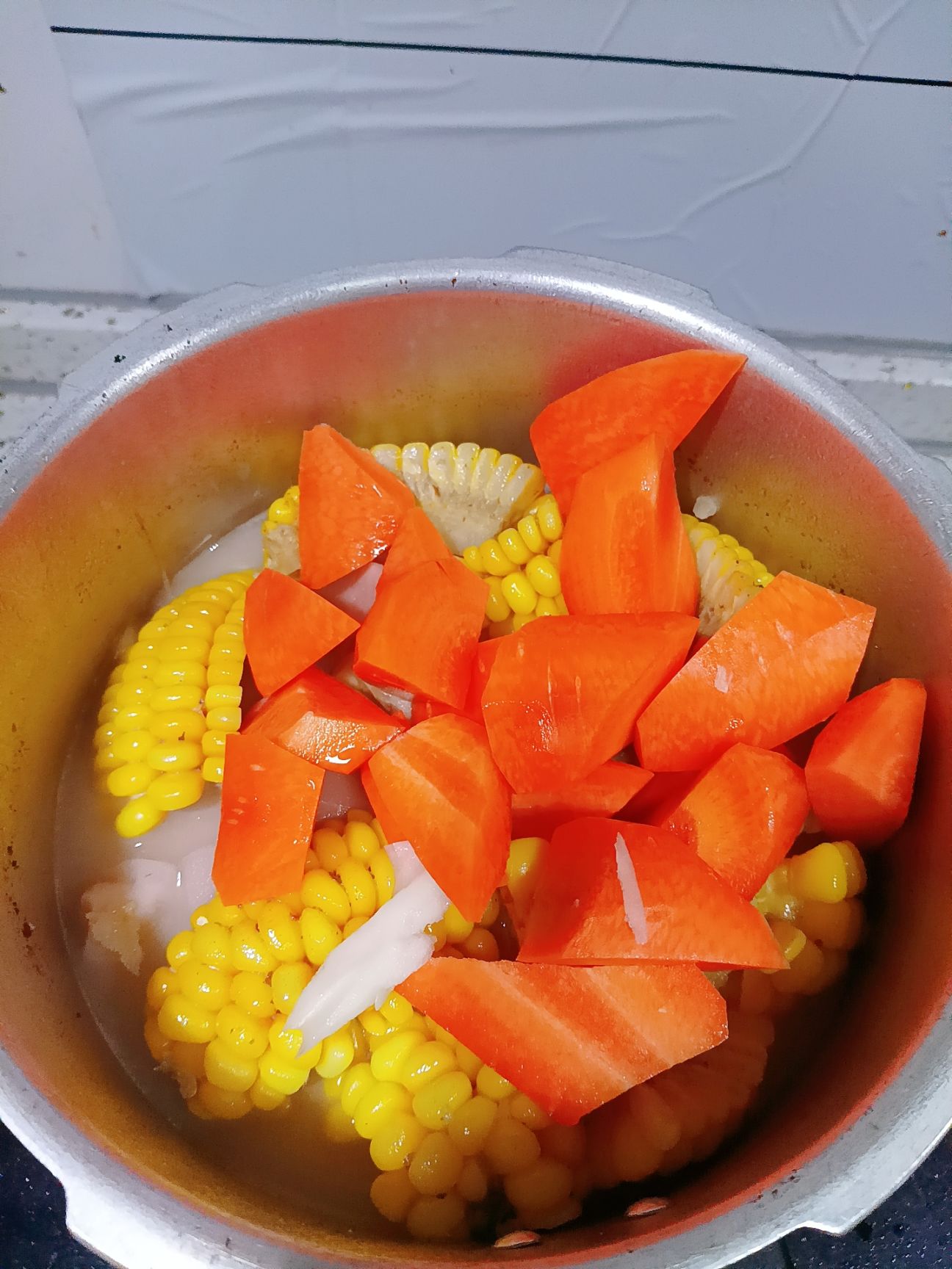 胡萝卜滚刀切。玉米切块。藕滚刀切。老姜切片