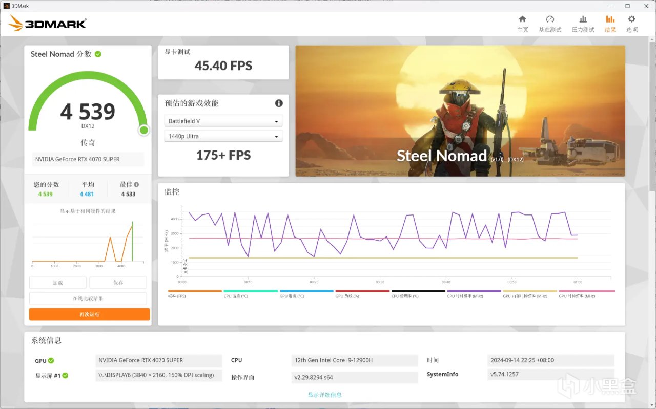 ▼Steel Nomad Light是3D Mark新推出的基準測試,衡量的是現代圖形API(DX12/Vulkan)在無光追、純光柵的實際性能,測得4539分,45.4FPS。