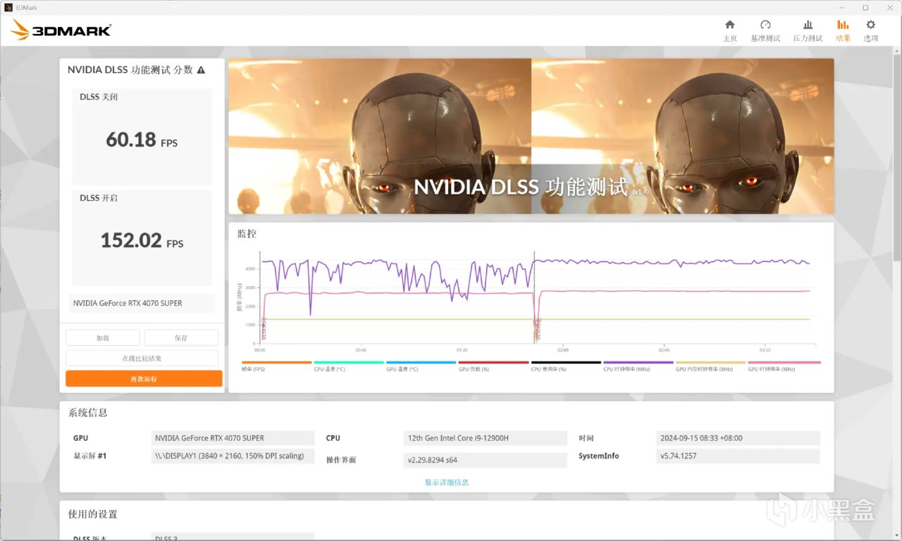 ▼NVDIA DLSS功能測試分數,在DLSS關閉時幀率爲60.18FPS、DLSS開啓後爲152.02,開啓後是未開啓時的2.53倍。