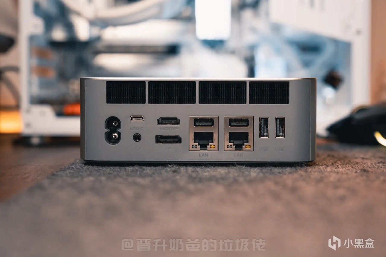 ▼背面接口堪稱豪華,有一個全功能的40Gbps雷電4接口,4個USB 3.2 Gen2接口,1個HDMI接口、1個DP 1.4a接口,2個2.5G有線接口,我們完全可以配合NAS的雙2.5G網絡接口使用SMB 3.0協議將與NAS的讀寫速度拉到500MB/s以上。emm,戳到我的心巴上了簡直。