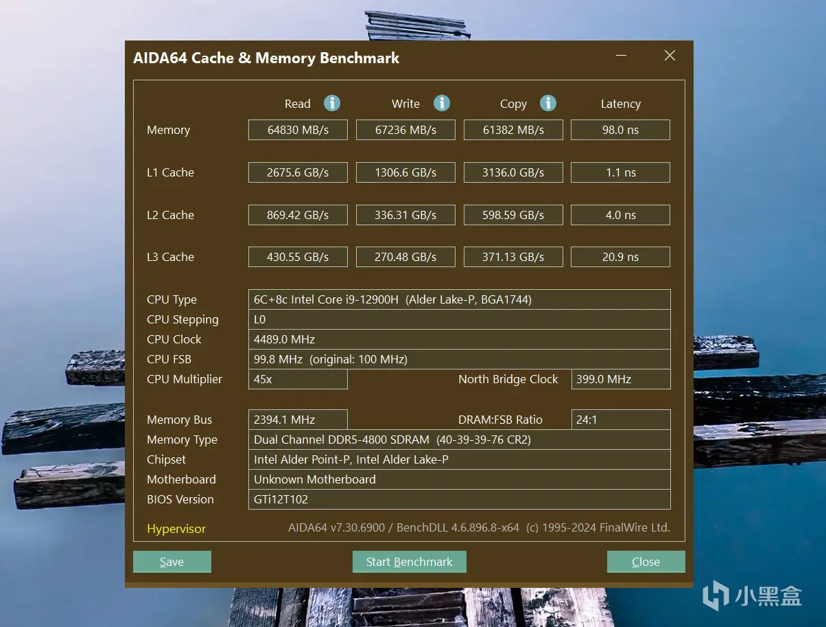 ▼通過AIDA64進行測試,5600MHz D5內存頻率之下,讀取速度爲64830MB/s,寫入速度爲67236MB/s,複製速度爲61382MB/s,延遲98ns,時序爲40-39-39-76 CR2,12代處理器盡力了。