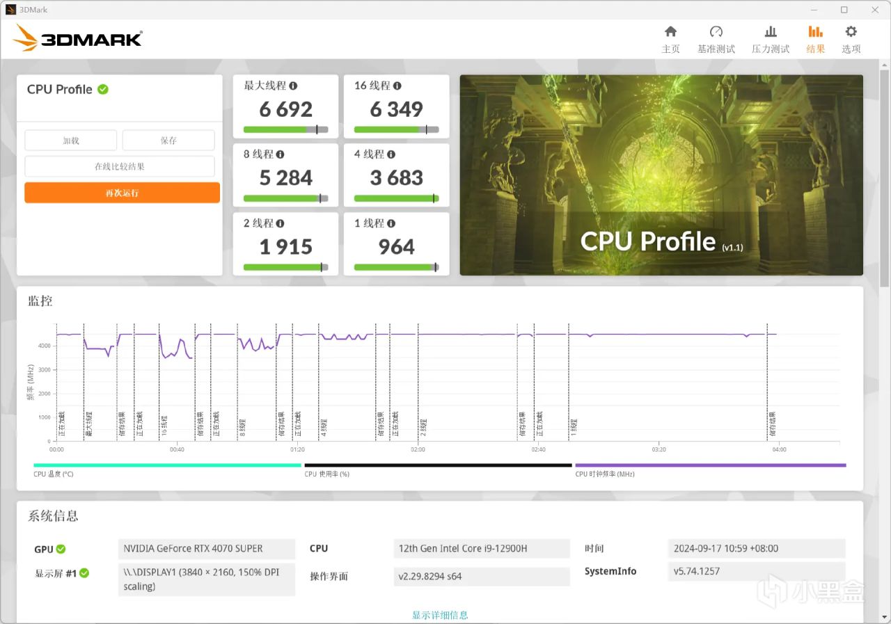 ▼使用3DMARK的CPU Profile進行測試,測得最大線程得分6692分,16線程得分6349分,8線程得分5284.