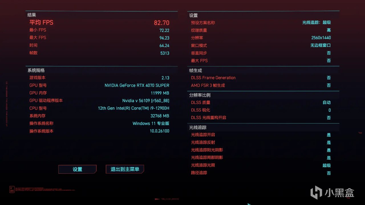 ▼《賽博朋克2077》賊喫顯卡性能的遊戲,在2K分辨率,全高預設畫質下(光線追蹤超級),拿到了82.7幀/s的成績,最小幀率72.22幀。