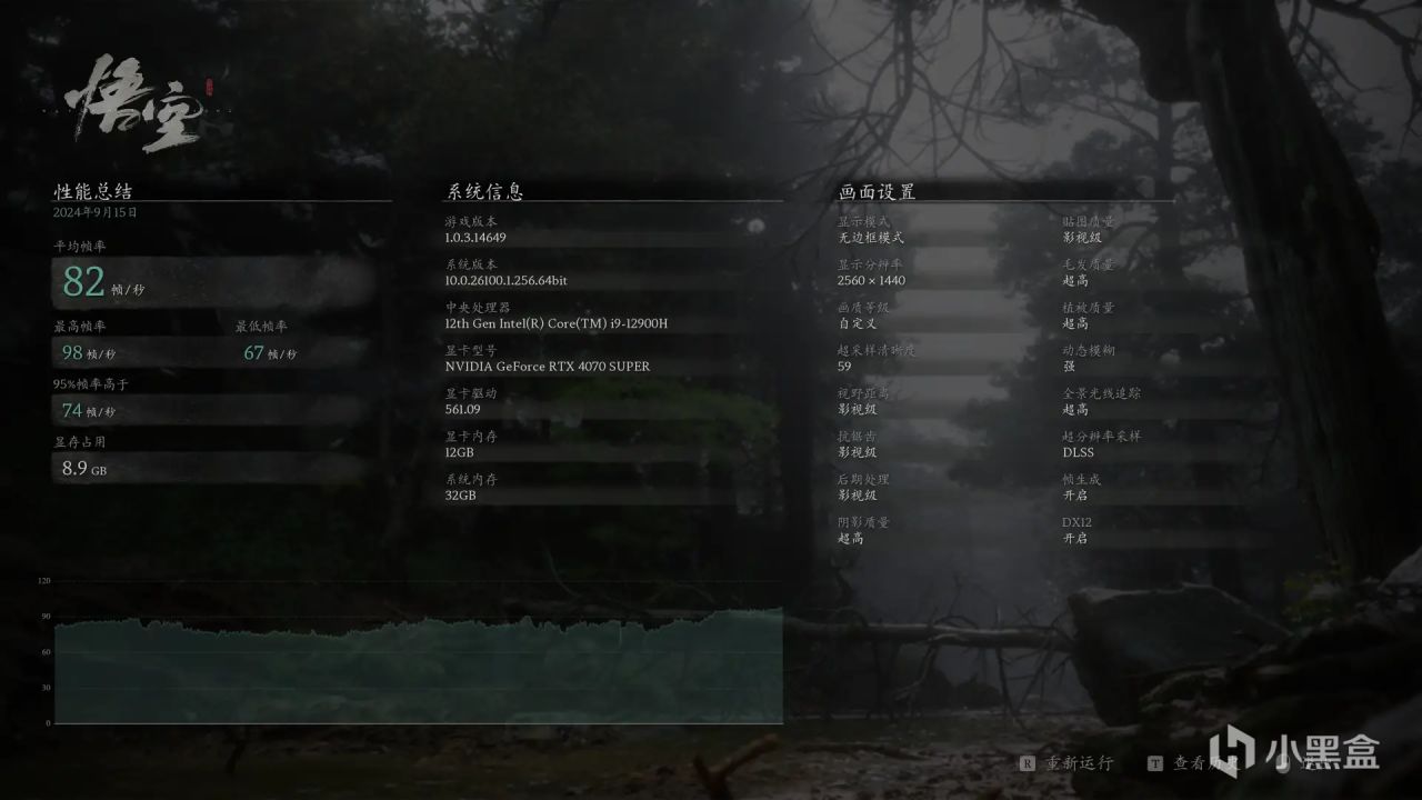 ▼《黑神話·悟空》按照索泰官方給出的推薦設置進行測試,2K分辨率、超高全景光線追蹤,開啓DLSS幀生成,超採樣清晰度59,畫質等級、視野距離、抗鋸齒、後期處理、貼圖質量、反射質量影視級,陰影質量、特效質量、毛髮質量、植被質量超高、全局光照高進行測試,最終得到了平均幀82幀/s,最低幀率68幀/s的成績,從測試結果上來看,零刻GTi12+EX顯卡塢+索泰RTX4070Super天啓的組合,在外置顯卡性能上幾乎沒有損耗,與索泰官方給出的測試結果幾乎完全一致。