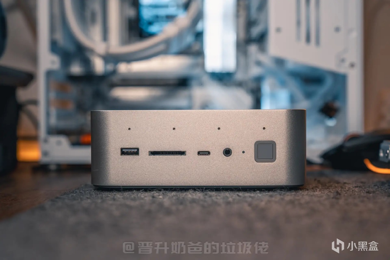 ▼前置接口上給到了1A1C兩個USB 3.2 Gen2 10Gbps接口、300MB/s以上讀寫能力的SD讀卡器接口、3.5mm音頻接口以及一個集成了指紋功能的電源按鈕。正面的四個小空空那個是麥克風矩陣,內置智能拾音降噪的B1 AI芯片,有一說一對於自媒體創作者、創意工作者相當友好。